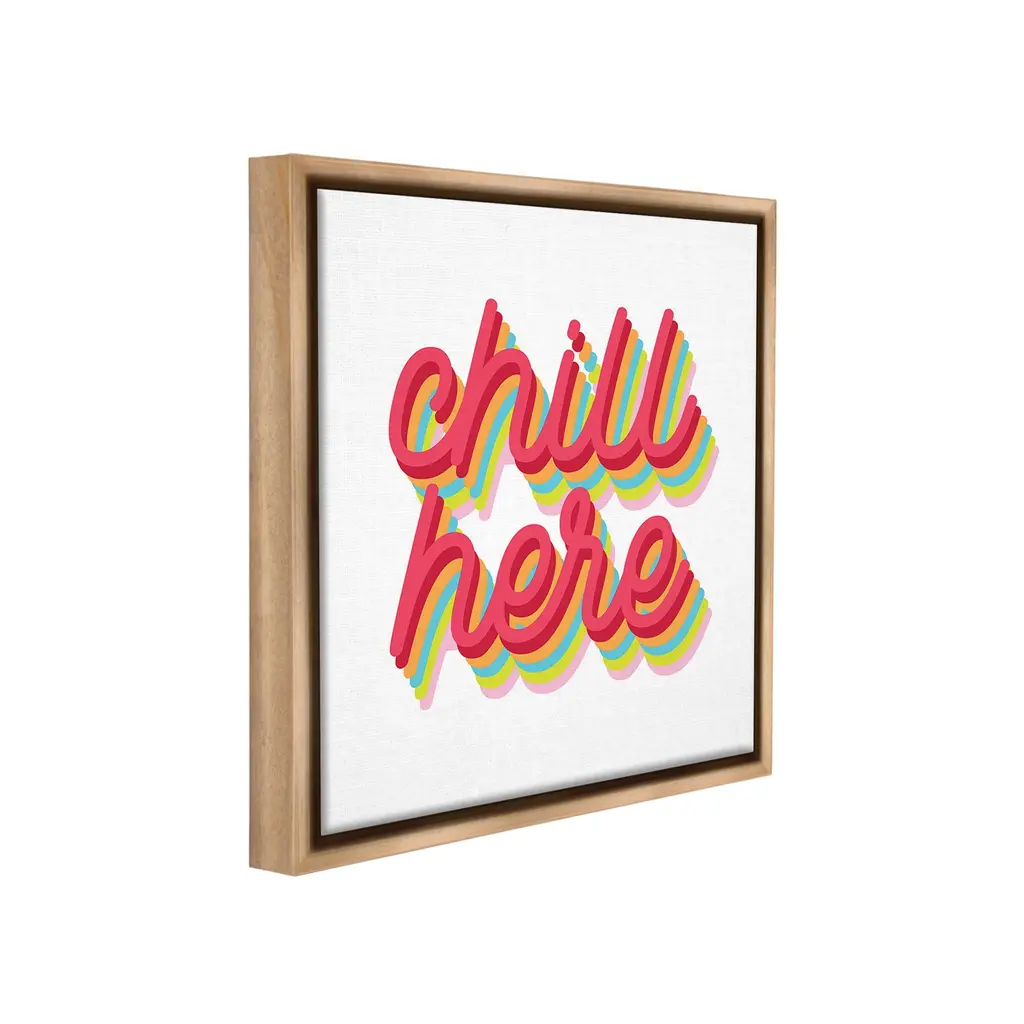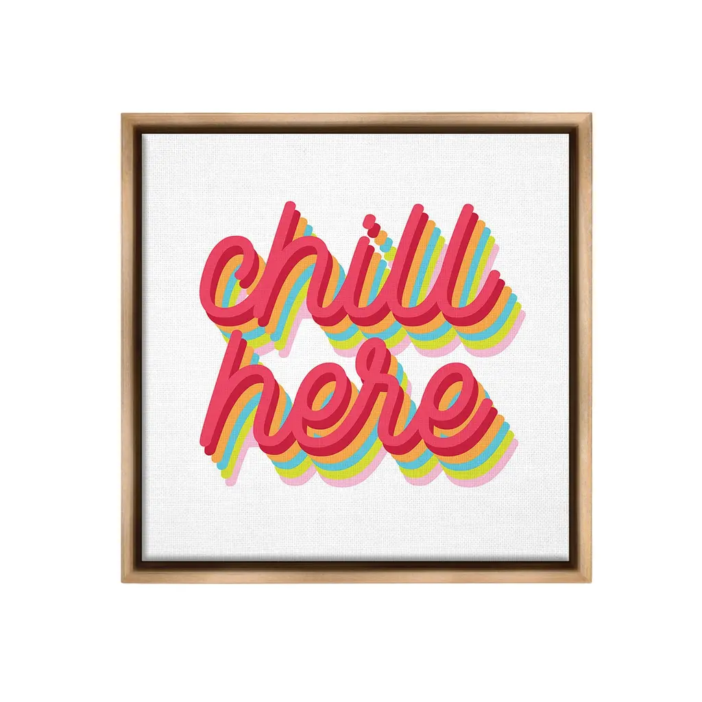 Elevate your home or office to the next level with Stupell Framed Floating Canvas Wall Art. Our premium hand-stretched canvas is mounted securely into a sturdy lightweight frame. The museum-style gap between the wrapped canvas and the box frame gives the illusion of floating artwork. Stupell Wall Art is made in the USA.Features: Dimensions: 18 x 1.7 x 18 Frame, 17 x 1.5 x 17 Canvas ArtFloating Frame Canvas Products are available in sizes 18"x18" and 25"x25". All Floating Frame Canvas Products have a 1.7" Depth.Wall Art is Ready to Hang with Hardware Free Hanging. No Installation required. For Easy Set Up Lean or Layer Artwork on Shelf or Against Wall. Artwork is Permently Fixed into the Frame.Our elevated 1.7" Thick Floating Frame is the perfect complement to our canvas style Wall Art. We use only the highest quality inks in house with industry leading printing solutions. Canvas is hand stretched over a durable wood foundation and then mounted securly into a Modern Box Frame. Made in the USA.Artwork Relates To: Phrase, Retro, Pattern, Stripes, Typography, Chill HereDesign by Lil' Rue