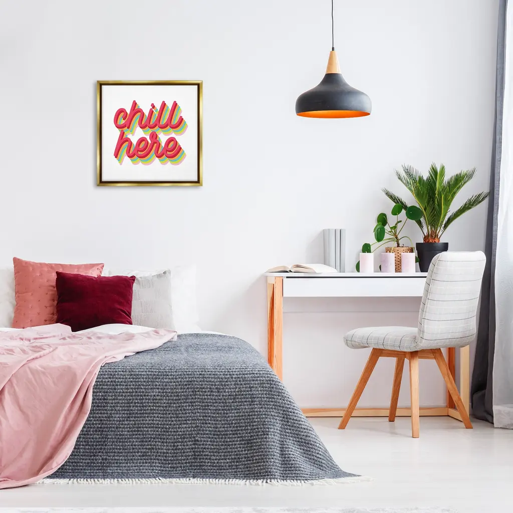 Elevate your home or office to the next level with Stupell Framed Floating Canvas Wall Art. Our premium hand-stretched canvas is mounted securely into a sturdy lightweight frame. The museum-style gap between the wrapped canvas and the box frame gives the illusion of floating artwork. Stupell Wall Art is made in the USA.Features: Dimensions: 18 x 1.7 x 18 Frame, 17 x 1.5 x 17 Canvas ArtFloating Frame Canvas Products are available in sizes 18"x18" and 25"x25". All Floating Frame Canvas Products have a 1.7" Depth.Wall Art is Ready to Hang with Hardware Free Hanging. No Installation required. For Easy Set Up Lean or Layer Artwork on Shelf or Against Wall. Artwork is Permently Fixed into the Frame.Our elevated 1.7" Thick Floating Frame is the perfect complement to our canvas style Wall Art. We use only the highest quality inks in house with industry leading printing solutions. Canvas is hand stretched over a durable wood foundation and then mounted securly into a Modern Box Frame. Made in the USA.Artwork Relates To: Phrase, Retro, Pattern, Stripes, Typography, Chill HereDesign by Lil' Rue