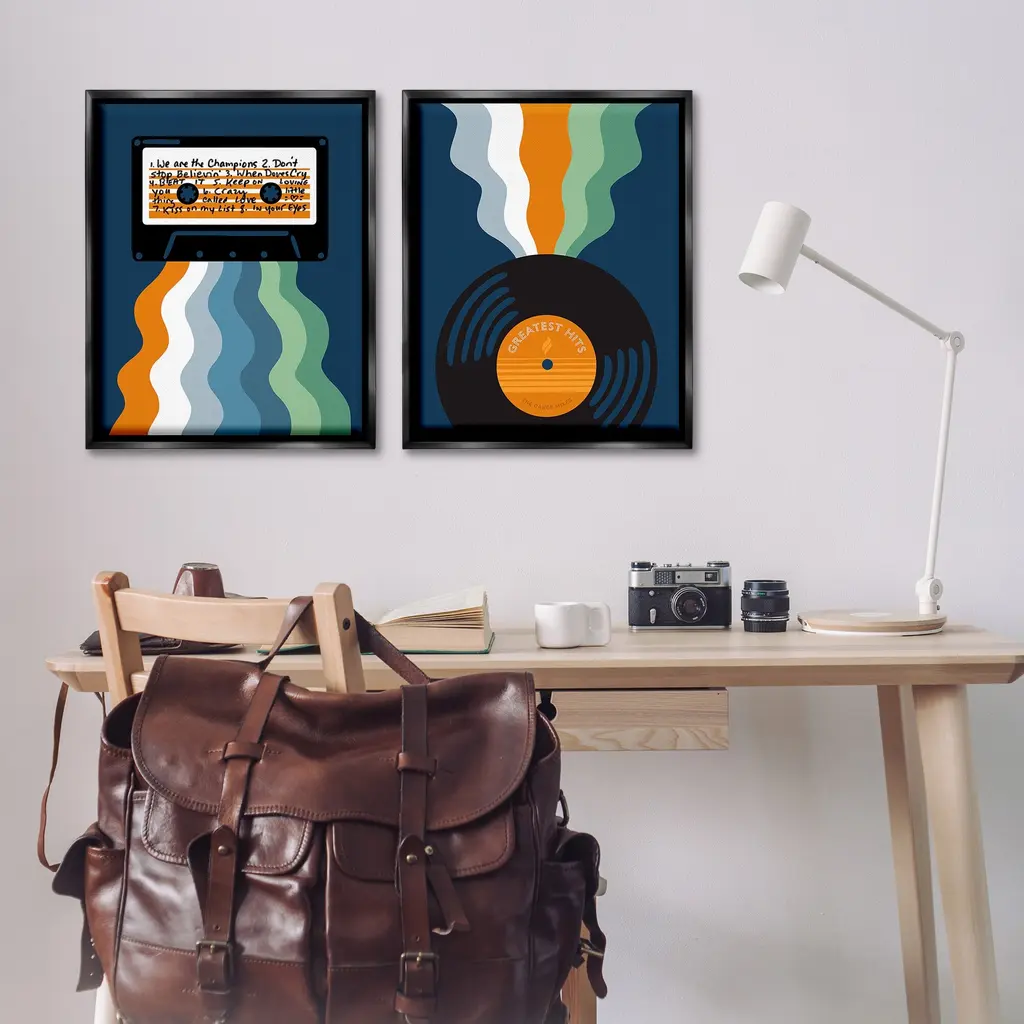 Elevate your home or office to the next level with Stupell Framed Floating Canvas Wall Art. Our premium hand-stretched canvas is mounted securely into a sturdy lightweight frame. The museum-style gap between the wrapped canvas and the box frame gives the illusion of floating artwork. Stupell Wall Art is made in the USA.Features: Dimensions: 2 Piece Set, Each Frame is 17 x 1.7 x 21Two Piece Floater Framed Canvas are available as 17x21 or 25x31 Panels. All Floater Frame Products have a 1.7" Depth.Wall Art is Ready to Hang with Hardware Free Hanging. No Installation required. For Easy Set Up Lean or Layer Artwork on Shelf or Against Wall. Artwork is Permently Fixed into the Frame.Our elevated 1.7" Thick Floating Frame is the perfect complement to our canvas style Wall Art. We use only the highest quality inks in house with industry leading printing solutions. Canvas is hand stretched over a durable wood foundation and then mounted securly into a Modern Box Frame. Made in the USA.Artwork Relates To: Cassette, Vinyl Record, Music, Musician, Retro, Groovy, Pattern, Stripes, Wavy, PlaylistDesign by Laura Marr