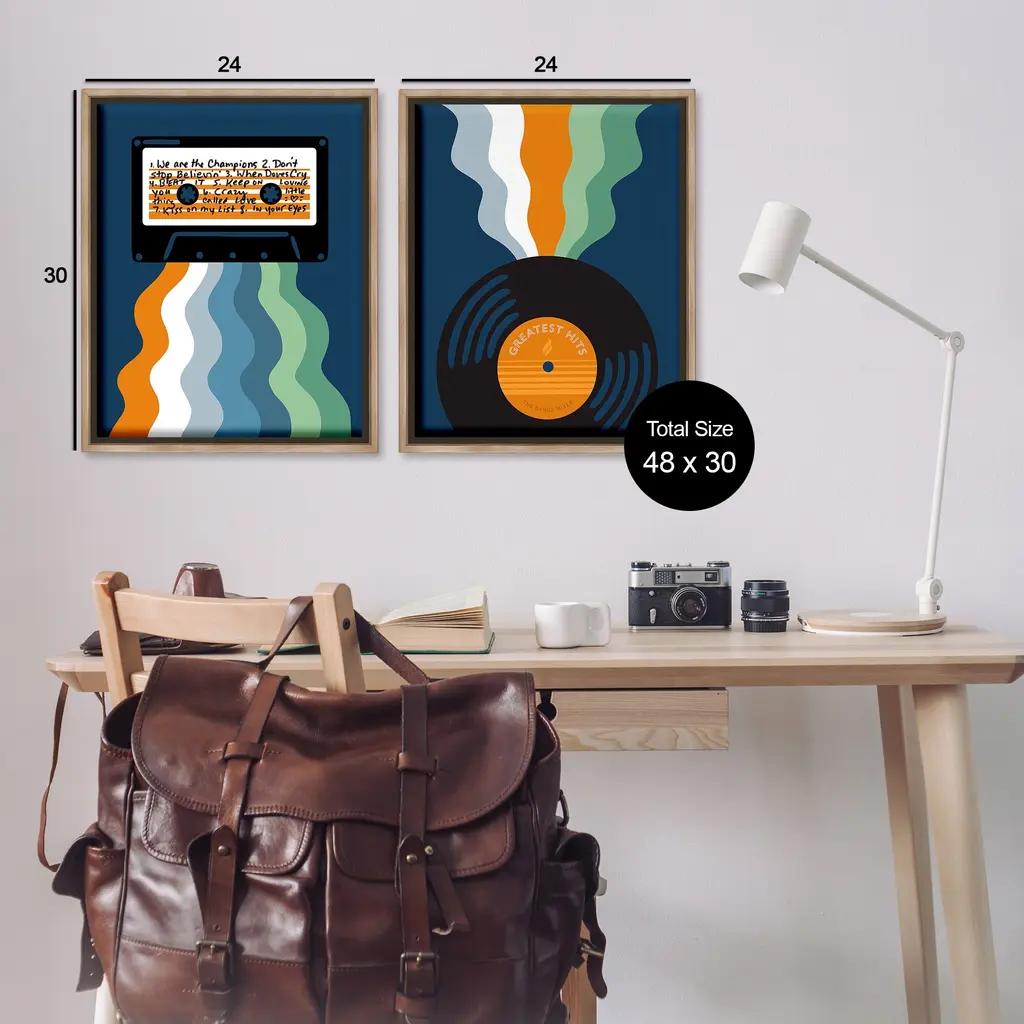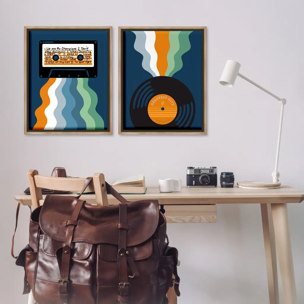 Elevate your home or office to the next level with Stupell Framed Floating Canvas Wall Art. Our premium hand-stretched canvas is mounted securely into a sturdy lightweight frame. The museum-style gap between the wrapped canvas and the box frame gives the illusion of floating artwork. Stupell Wall Art is made in the USA.Features: Dimensions: 2 Piece Set, Each Frame is 17 x 1.7 x 21Two Piece Floater Framed Canvas are available as 17x21 or 25x31 Panels. All Floater Frame Products have a 1.7" Depth.Wall Art is Ready to Hang with Hardware Free Hanging. No Installation required. For Easy Set Up Lean or Layer Artwork on Shelf or Against Wall. Artwork is Permently Fixed into the Frame.Our elevated 1.7" Thick Floating Frame is the perfect complement to our canvas style Wall Art. We use only the highest quality inks in house with industry leading printing solutions. Canvas is hand stretched over a durable wood foundation and then mounted securly into a Modern Box Frame. Made in the USA.Artwork Relates To: Cassette, Vinyl Record, Music, Musician, Retro, Groovy, Pattern, Stripes, Wavy, PlaylistDesign by Laura Marr