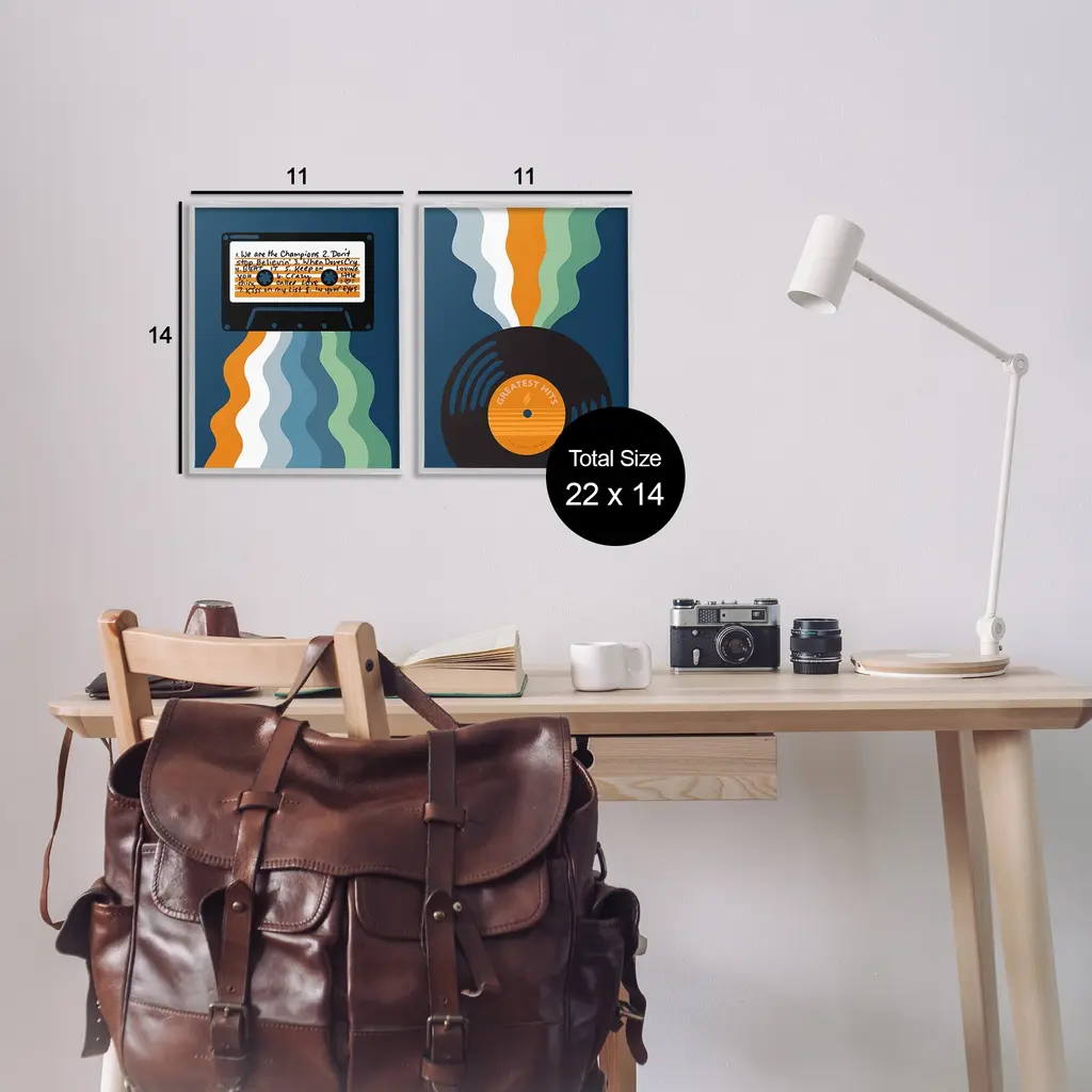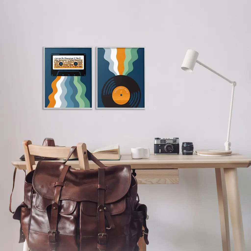 Fill any space in your home or office with our Framed Wall Art Sets. Our framed artwork is securely mounted into a 1.5-inch thick wood grain frame and ready to hang. Frames are available in three alluring styles: black, gray farmhouse and white. Stupell Wall Art is made in the USA.Features: Dimensions: 2 Piece Set, Each Panel is 11 x 1.5 x 14 FramedTwo Piece Framed Giclee Sets are available as 11"x14", 16"x20" or 24"x30" Panels. All Framed Giclee Products have a 1.5" Depth.Wall Art is Ready to Hang with Hardware Free Hanging. No installation required. For Easy Set Up Lean or Layer Artwork on Shelf or Against Wall.Curated Wall Art Sets make it easy for you complete the theme for any room. Our giclée prints are carefully mounted on a durable MDF backing, and then perfectly finished in a 1.5 inch thick woodgrain frame. Mounted frame colors include black, gray farmhouse and white. Made In USA.Artwork Relates To: Cassette, Vinyl Record, Music, Musician, Retro, Groovy, Pattern, Stripes, Wavy, PlaylistDesign by Laura Marr