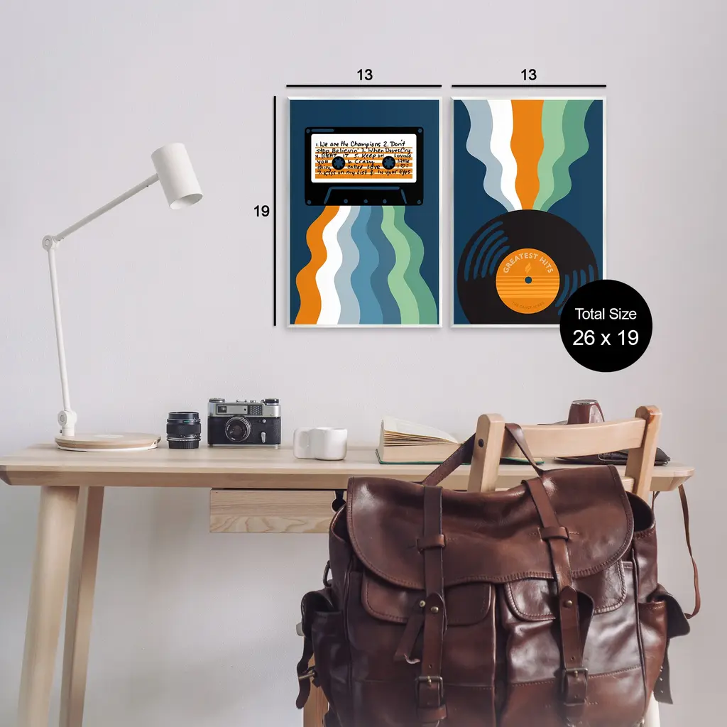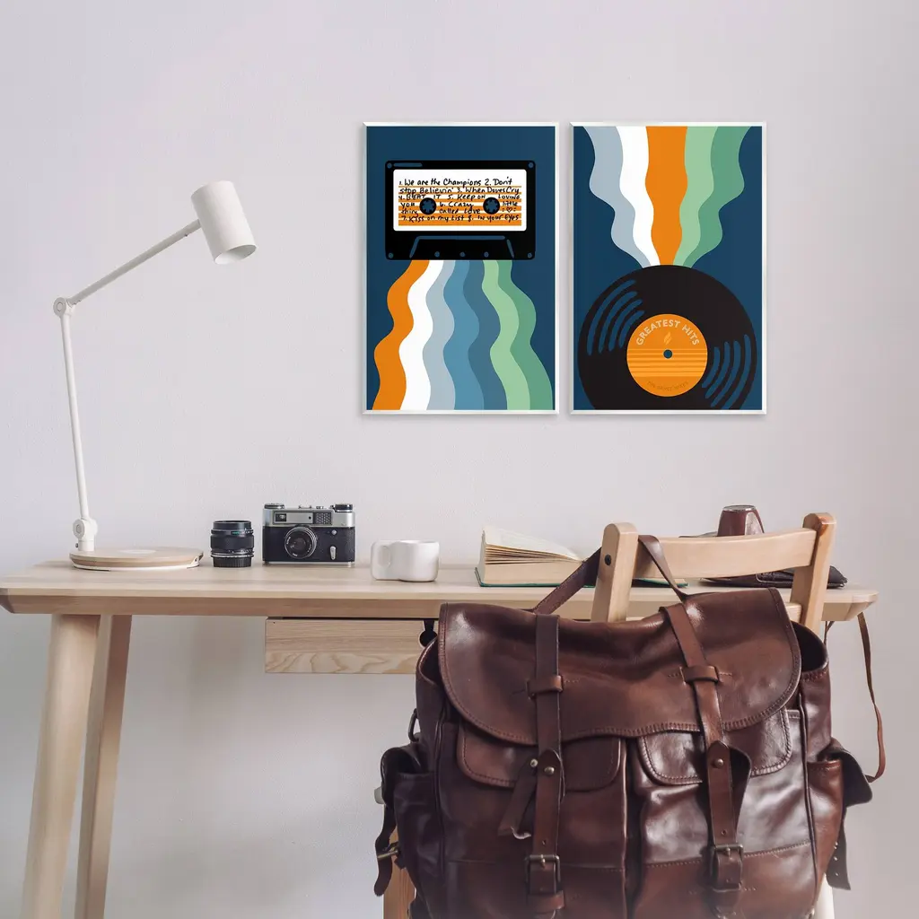 Fill any space with Stupell Wall Art Sets. Our wall plaques start as high-quality lithograph prints mounted on durable 0.5-inch thick MDF wood. Each piece is hand finished and comes with a fresh layer of white foil on the sides to give it a crisp, clean look. Plaques arrive ready to hang without installation and come with removable plastic corners to keep them from damage in transit. Stupell Wall Art is made in the USA.Features: Dimensions: 2 Piece Set, Each Panel is 10 x 0.5 x 15 InchesTwo Piece Wall Plaque Sets are available as 10"x15" or 13"x19" Panels. All Wall Art Plaques have a 0.5" Depth.Wall Art is Ready to Hang with Hardware Free Hanging. No installation required. For Easy Set Up Lean or Layer Artwork on Shelf or Against Wall.All of our wall plaques start off as high quality lithograph prints that are then mounted on durable 0.5 inch thick MDF wood. Each piece is hand finished and comes with a fresh layer of foil on the sides to give it a crisp clean look. Made In USA.Artwork Relates To: Cassette, Vinyl Record, Music, Musician, Retro, Groovy, Pattern, Stripes, Wavy, PlaylistDesign by Laura Marr