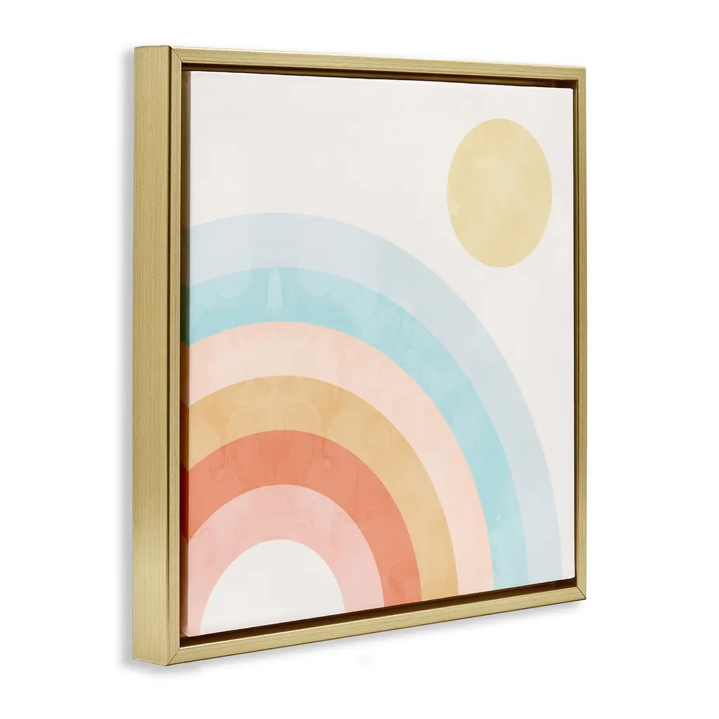 Elevate your home or office to the next level with Stupell Framed Floating Canvas Wall Art. Our premium hand-stretched canvas is mounted securely into a sturdy lightweight frame. The museum-style gap between the wrapped canvas and the box frame gives the illusion of floating artwork. Stupell Wall Art is made in the USA.Features: Dimensions: 18 x 1.7 x 18 Frame, 17 x 1.5 x 17 Canvas ArtFloating Frame Canvas Products are available in sizes 18"x18" and 25"x25". All Floating Frame Canvas Products have a 1.7" Depth.Wall Art is Ready to Hang with Hardware Free Hanging. No Installation required. For Easy Set Up Lean or Layer Artwork on Shelf or Against Wall. Artwork is Permently Fixed into the Frame.Our elevated 1.7" Thick Floating Frame is the perfect complement to our canvas style Wall Art. We use only the highest quality inks in house with industry leading printing solutions. Canvas is hand stretched over a durable wood foundation and then mounted securly into a Modern Box Frame. Made in the USA.Artwork Relates To: Abstract, Pattern, Geometric, Sun, Rainbow, PastelDesign by Daphne Polselli