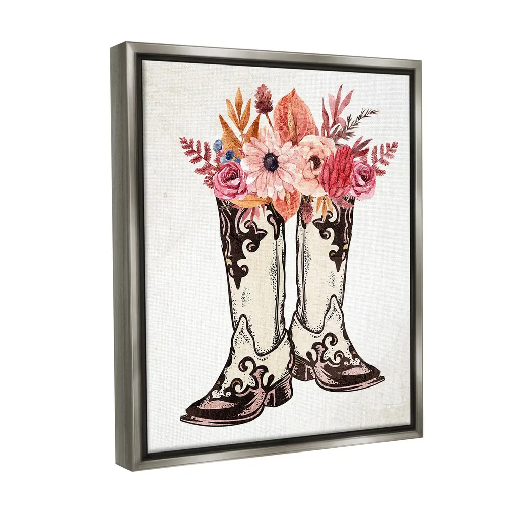 Elevate your home or office to the next level with Stupell Framed Floating Canvas Wall Art. Our premium hand-stretched canvas is mounted securely into a sturdy lightweight frame. The museum-style gap between the wrapped canvas and the box frame gives the illusion of floating artwork. Stupell Wall Art is made in the USA.Features: Dimensions: 17 x 1.7 x 21 Frame, 16 x 1.5 x 20 Canvas ArtFloating Frame Canvas Products are available in sizes 17"x21" and 25"x31". All Floating Frame Canvas Products have a 1.7" Depth.Wall Art is Ready to Hang with Hardware Free Hanging. No Installation required. For Easy Set Up Lean or Layer Artwork on Shelf or Against Wall. Artwork is Permently Fixed into the Frame.Our elevated 1.7" Thick Floating Frame is the perfect complement to our canvas style Wall Art. We use only the highest quality inks in house with industry leading printing solutions. Canvas is hand stretched over a durable wood foundation and then mounted securly into a Modern Box Frame. Made in the USA.Artwork Relates To: Equestrian, Rodeo, Country, Southwestern, Cowgirl, Boots, Floral, Flower, Rustic, BouquetDesign by Kim Allen