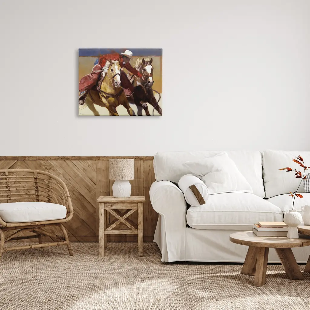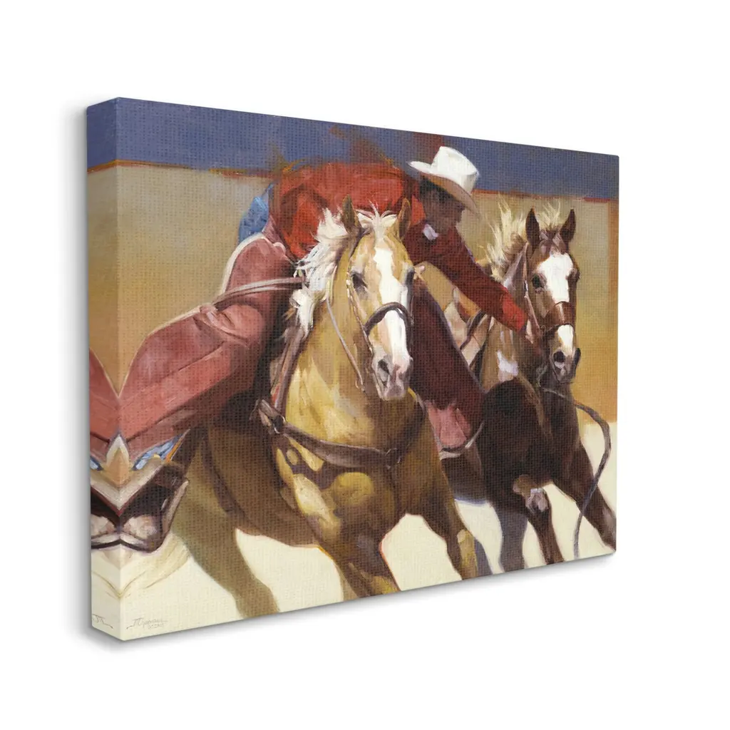 We create our stretched canvas to the highest standards. Using only the highest quality inks and canvas on Mimaki printers, we hand-cut and stretch each piece over a 1.5-inch thick wooden frame for hanging. As a result, the art comes ready to hang on the sturdy ledge with no installation required. Stupell Wall Art is made in the USA.Features: Dimensions: 20 x 1.5 x 16 InchesStretched Canvas Sizes Include Standard: 20 x 1.5 x 16 Large: 30 x 1.5 x 20 X-Large: 40 x 1.5 x 30 Oversized: 48 x 1.5 x 36Wall Art is Ready to Hang with Hardware Free Hanging. No installation required. For Easy Set Up Lean or Layer Artwork on Shelf or Against Wall.Our stretched canvas is created with the highest standards. We use only the highest quality inks and canvas on our in house Mimaki printers, and then hand cut and stretch each piece over a 1.5 inch thick wooden frame for hanging. Made In USA.Artwork Relates To: Painting, Person, Halter, Animal, Horse, Mammal, Equestrian, RodeoDesign by Julie T. Chapman
