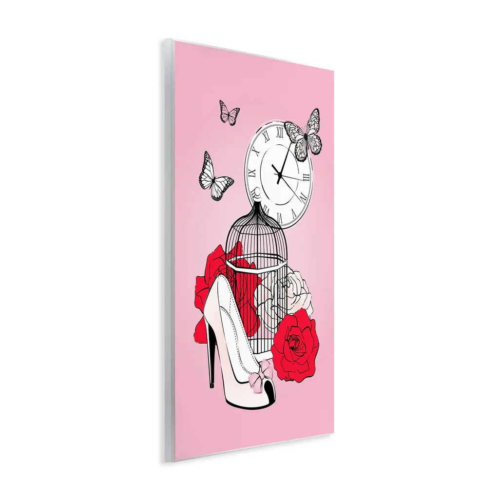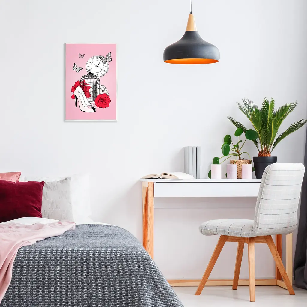 Our wall plaques start as high-quality lithograph prints mounted on durable 0.5-inch thick MDF wood. Each piece is hand finished and comes with a fresh layer of white foil on the sides to give it a crisp, clean look. Plaques arrive ready to hang without installation and come with removable plastic corners to keep them from damage in transit. Stupell Wall Art is made in the USA.Features: Dimensions: 10 x 0.5 x 15 InchesWall Plaque Product Sizes Include 10"x15" and 13"x19". All wall plaque products have a 0.5" Depth. Wall Art is Ready to Hang with Hardware Free Hanging. No installation required. For Easy Set Up Lean or Layer Artwork on Shelf or Against Wall.All of our wall plaques start off as high quality lithograph prints that are then mounted on durable 0.5 inch thick MDF wood. Each piece is hand finished and comes with a fresh layer of foil on the sides to give it a crisp clean look. Made In USA.Artwork Relates To: Glam, Fashion, Shoes, Heel, Clock, Butterfly, Flower, FloralDesign by Martina Pavlova