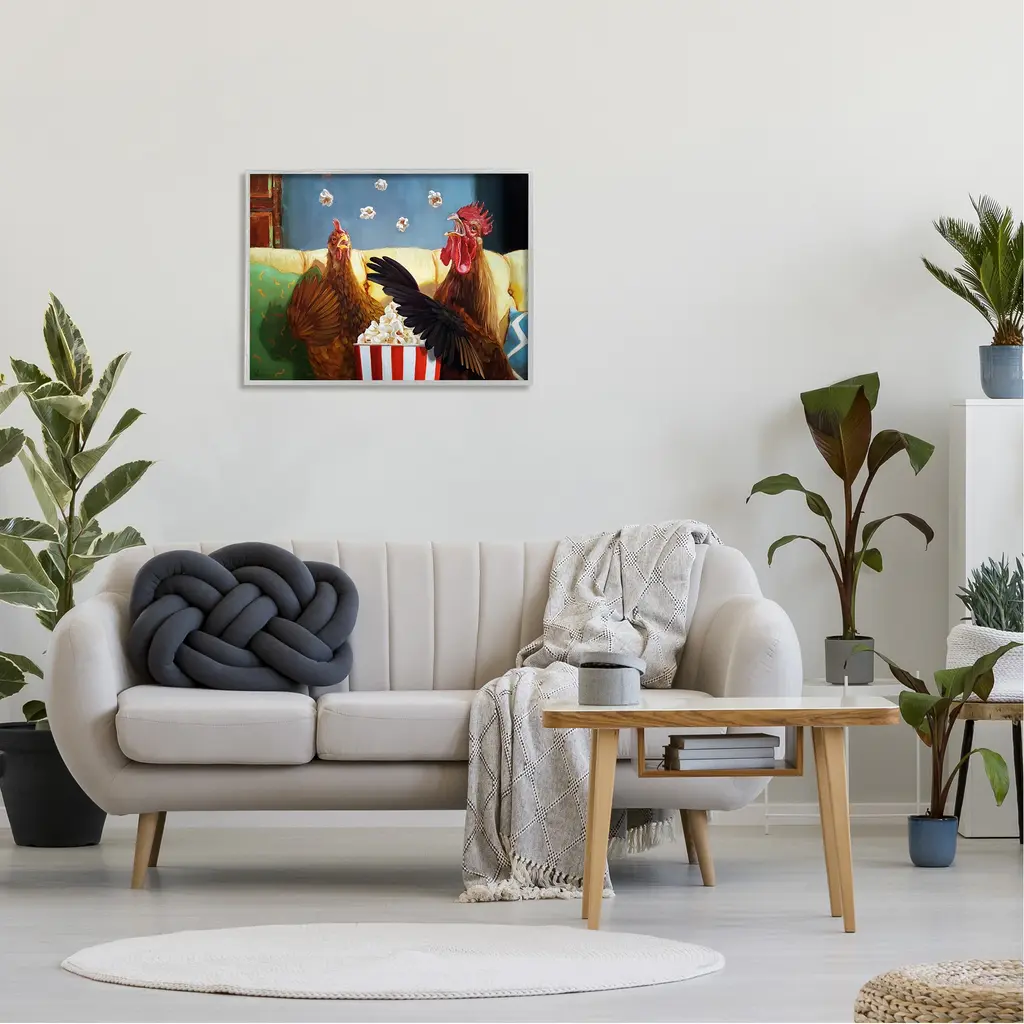 Stupell Rooster Chicken Tossing Catching Popcorn Movie Night Framed Wall Art - Multi-Color - 20 X 16 - Grey