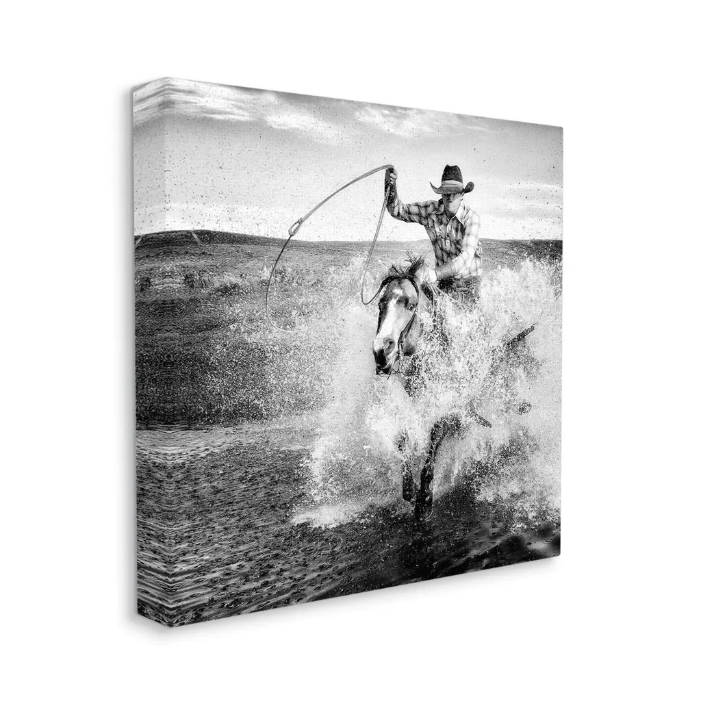 We create our stretched canvas to the highest standards. Using only the highest quality inks and canvas on Mimaki printers, we hand-cut and stretch each piece over a 1.5-inch thick wooden frame for hanging. As a result, the art comes ready to hang on the sturdy ledge with no installation required. Stupell Wall Art is made in the USA.Features: Dimensions: 17 x 1.5 x 17 InchesStretched Canvas Sizes Include Standard: 17 x 1.5 x 17 Large: 24 x 1.5 x 24 X-Large: 30 x 1.5 x 30 Oversized: 36 x 1.5 x 36Wall Art is Ready to Hang with Hardware Free Hanging. No installation required. For Easy Set Up Lean or Layer Artwork on Shelf or Against Wall.Our stretched canvas is created with the highest standards. We use only the highest quality inks and canvas on our in house Mimaki printers, and then hand cut and stretch each piece over a 1.5 inch thick wooden frame for hanging. Made In USA.Artwork Relates To: Animal, Horse, Mammal, Person, Saddle, Halter, Cowboy, Lasso, Rodeo, Photography, Water, SplashDesign by PBurchettePhoto