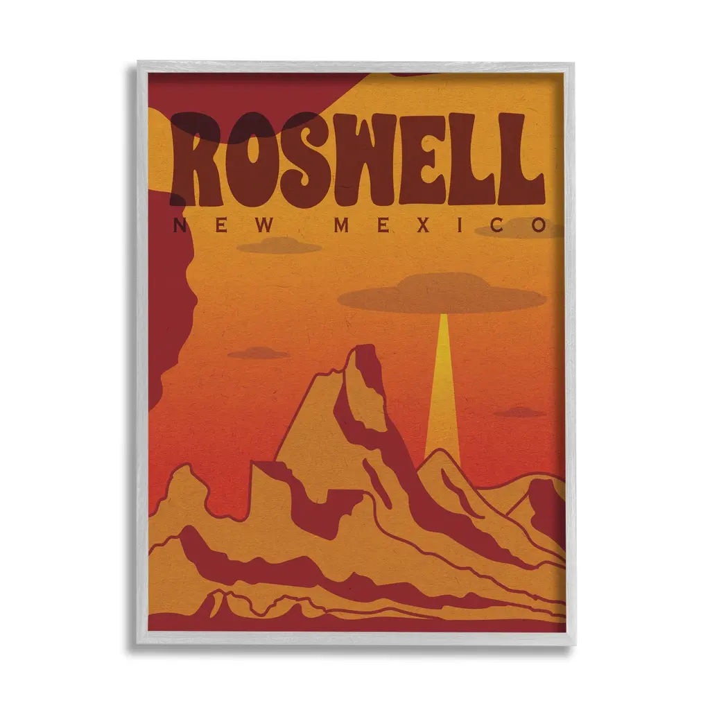 Add dimension to any room with our textured Framed Giclee Artwork. Our framed artwork is securely mounted into a 1.5-inch thick wood grain frame and ready to hang. Frames are available in three alluring styles: black, gray farmhouse and white. In addition, you should check out our oversized options if you want a statement piece. Stupell Wall Art is made in the USA.Features: Dimensions: 11 x 1.5 x 14 FramedFramed Giclee Sizes Include Standard: 11 x 1.5 x 14 Large: 16 x 1.5 x 20 Oversized: 24 x 1.5 x 30Wall Art is Ready to Hang - No Installation or Hardware Needed. For Easy Set Up Lean or Layer Artwork on Shelf or Against Wall.Our giclée prints are carefully mounted on a durable MDF backing, and then perfectly finished in a 1.5 inch thick woodgrain frame. Mounted frame colors include black, gray farmhouse and white. Made In USA.Artwork Relates To: Desert, Cliffs, Sunset, Vintage, UFO, Roswell New MexicoDesign by Lil' Rue