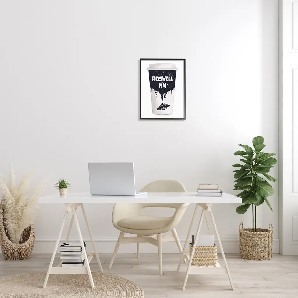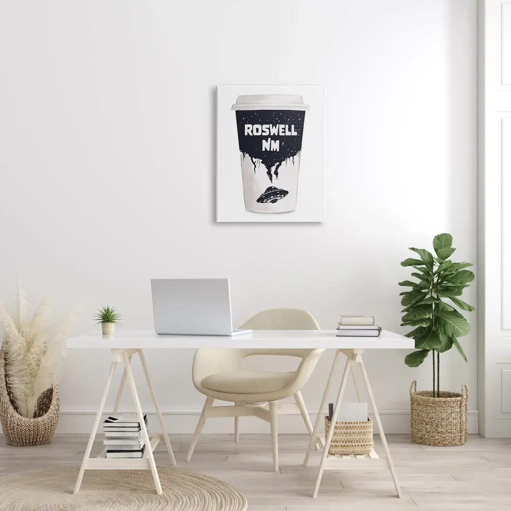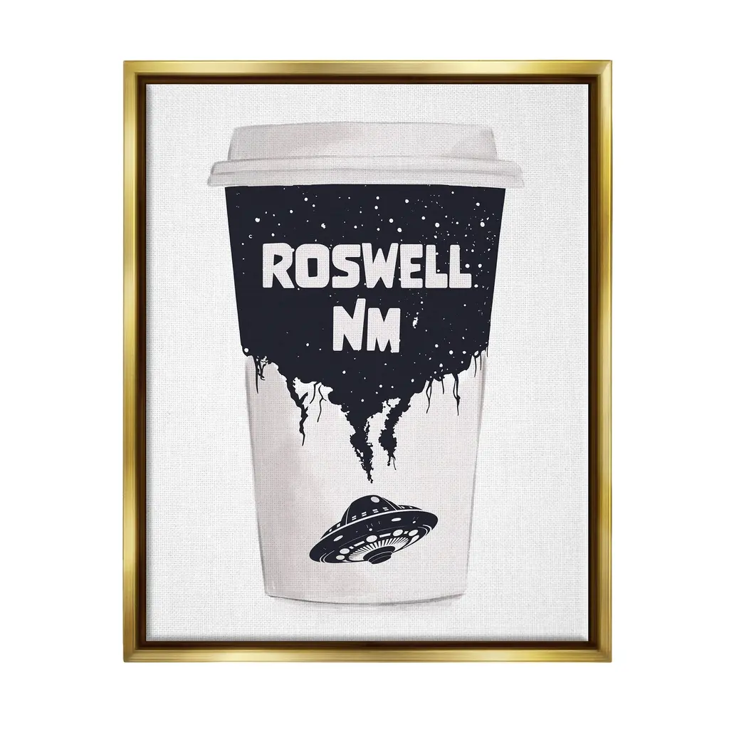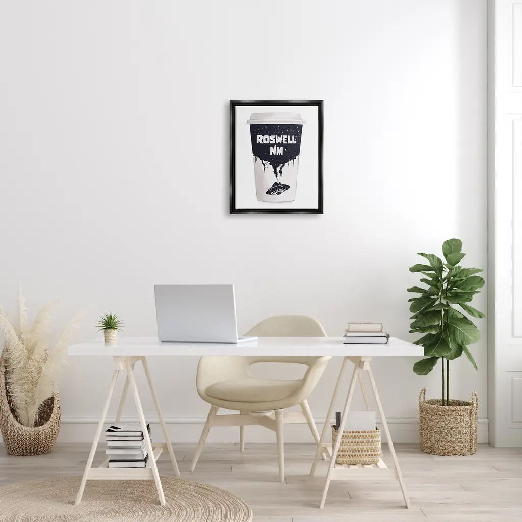 Elevate your home or office to the next level with Stupell Framed Floating Canvas Wall Art. Our premium hand-stretched canvas is mounted securely into a sturdy lightweight frame. The museum-style gap between the wrapped canvas and the box frame gives the illusion of floating artwork. Stupell Wall Art is made in the USA.Features: Dimensions: 17 x 1.7 x 21 Frame, 16 x 1.5 x 20 Canvas ArtFloating Frame Sizes Include Standard: 17 x 1.7 x 21 Oversized: 25 x 1.7 x 31Wall Art is Ready to Hang - No Installation or Hardware Needed. For Easy Set Up Lean or Layer Artwork on Shelf or Against Wall.Our elevated 1.7" Thick Floating Frame is the perfect complement to our canvas style Wall Art. We use only the highest quality inks in house with industry leading printing solutions. Canvas is hand stretched over a durable wood foundation and then mounted securly into a Modern Box Frame. Made in the USA.Artwork Relates To: UFO, Roswell New Mexico, Coffee Cup, SpaceDesign by Ziwei Li