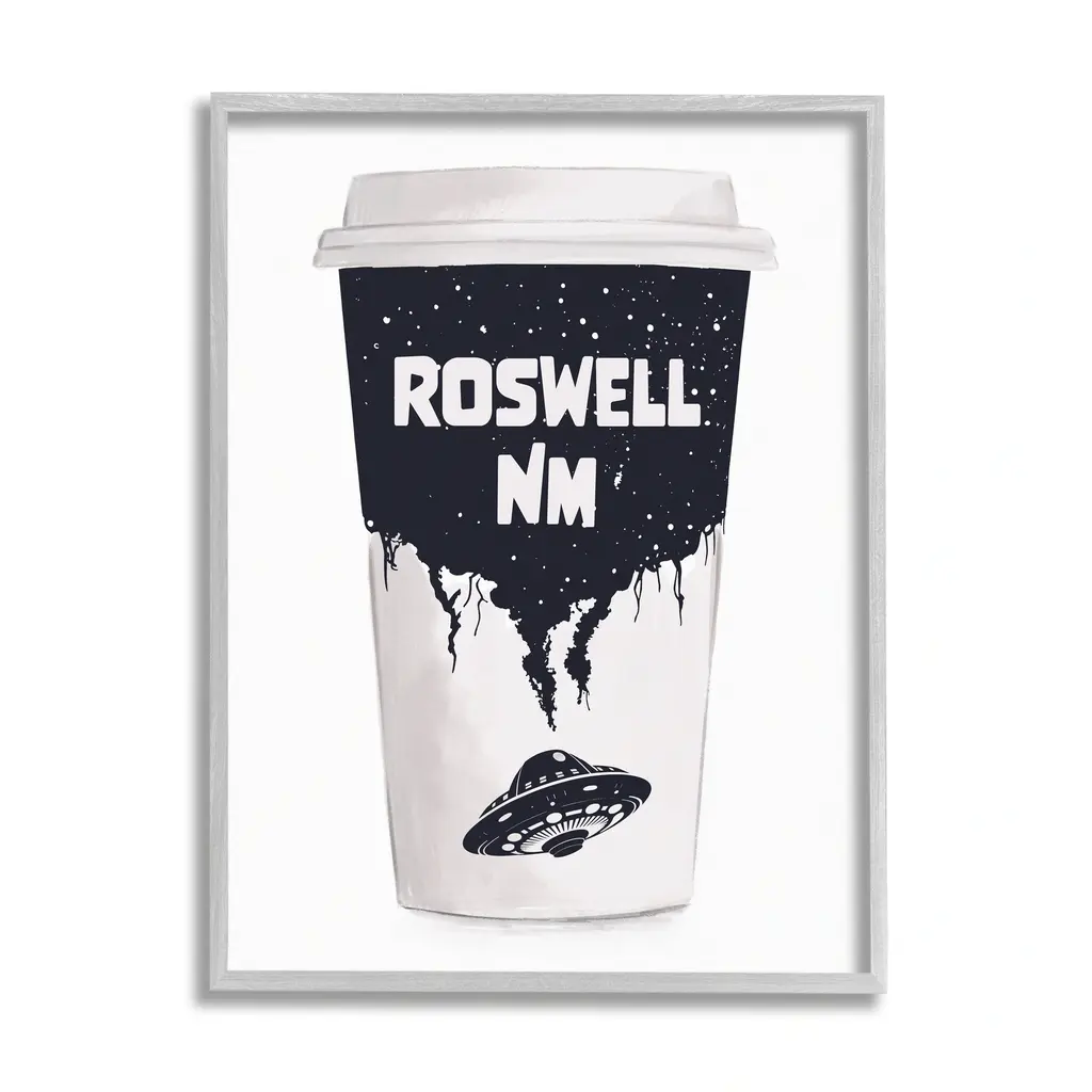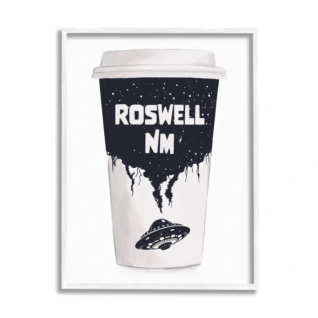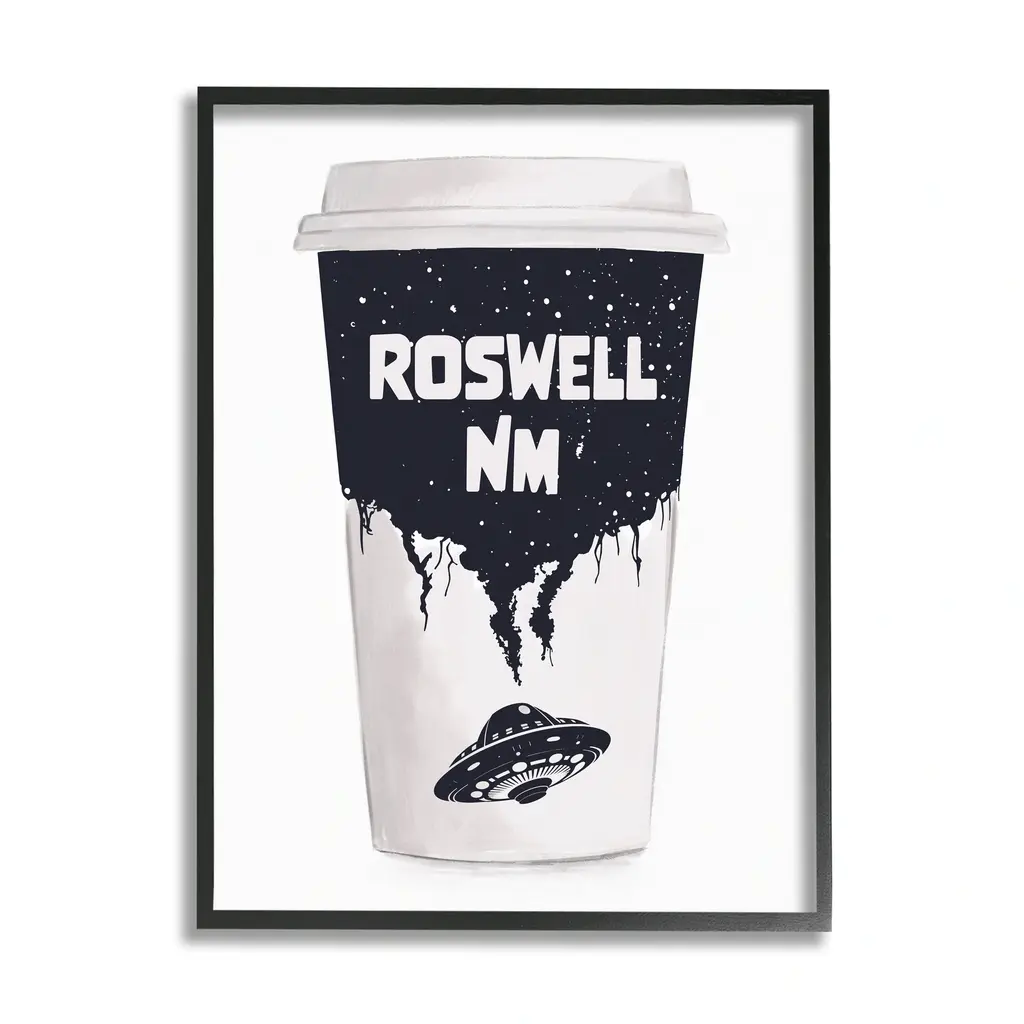 Add dimension to any room with our textured Framed Giclee Artwork. Our framed artwork is securely mounted into a 1.5-inch thick wood grain frame and ready to hang. Frames are available in three alluring styles: black, gray farmhouse and white. In addition, you should check out our oversized options if you want a statement piece. Stupell Wall Art is made in the USA.Features: Dimensions: 11 x 1.5 x 14 FramedFramed Giclee Sizes Include Standard: 11 x 1.5 x 14 Large: 16 x 1.5 x 20 Oversized: 24 x 1.5 x 30Wall Art is Ready to Hang - No Installation or Hardware Needed. For Easy Set Up Lean or Layer Artwork on Shelf or Against Wall.Our giclée prints are carefully mounted on a durable MDF backing, and then perfectly finished in a 1.5 inch thick woodgrain frame. Mounted frame colors include black, gray farmhouse and white. Made In USA.Artwork Relates To: UFO, Roswell New Mexico, Coffee Cup, SpaceDesign by Ziwei Li