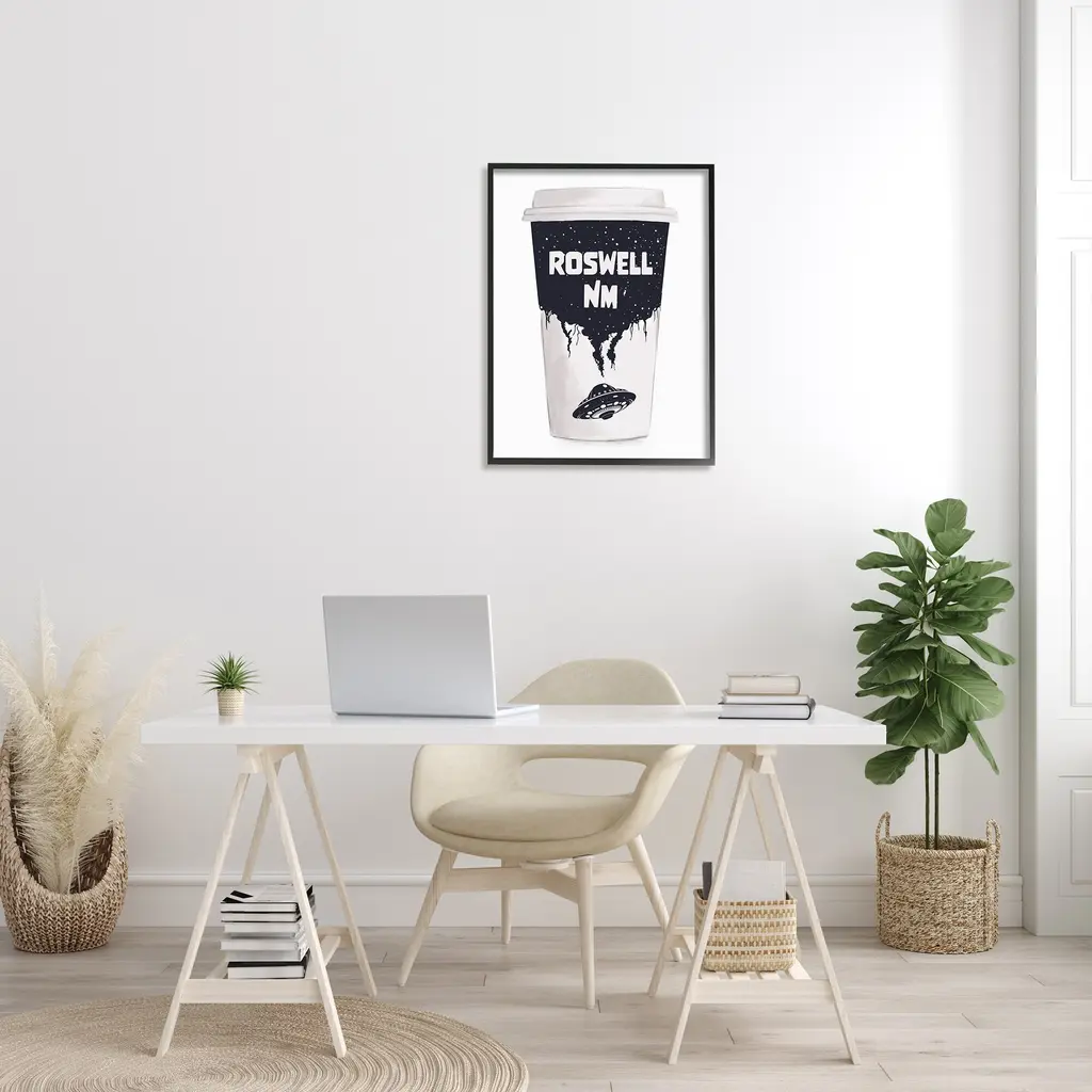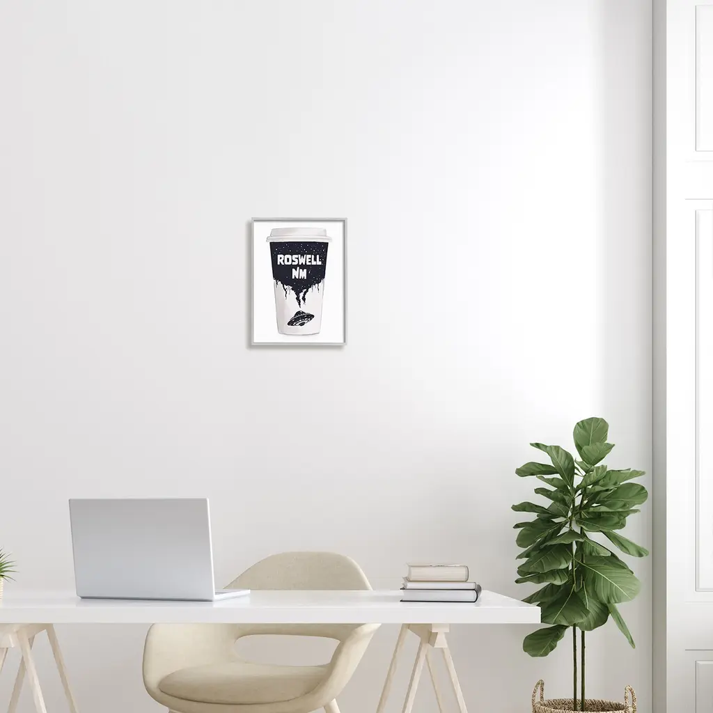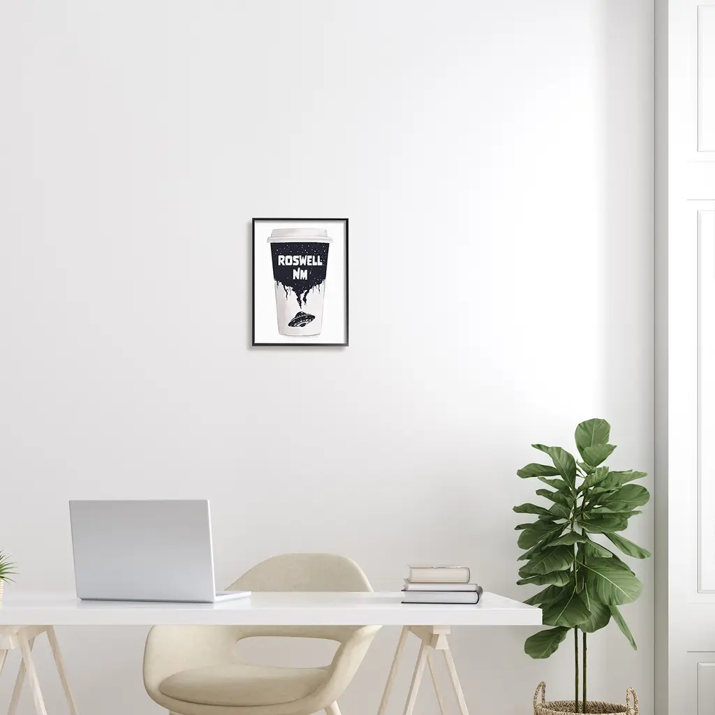 Add dimension to any room with our textured Framed Giclee Artwork. Our framed artwork is securely mounted into a 1.5-inch thick wood grain frame and ready to hang. Frames are available in three alluring styles: black, gray farmhouse and white. In addition, you should check out our oversized options if you want a statement piece. Stupell Wall Art is made in the USA.Features: Dimensions: 11 x 1.5 x 14 FramedFramed Giclee Sizes Include Standard: 11 x 1.5 x 14 Large: 16 x 1.5 x 20 Oversized: 24 x 1.5 x 30Wall Art is Ready to Hang - No Installation or Hardware Needed. For Easy Set Up Lean or Layer Artwork on Shelf or Against Wall.Our giclée prints are carefully mounted on a durable MDF backing, and then perfectly finished in a 1.5 inch thick woodgrain frame. Mounted frame colors include black, gray farmhouse and white. Made In USA.Artwork Relates To: UFO, Roswell New Mexico, Coffee Cup, SpaceDesign by Ziwei Li