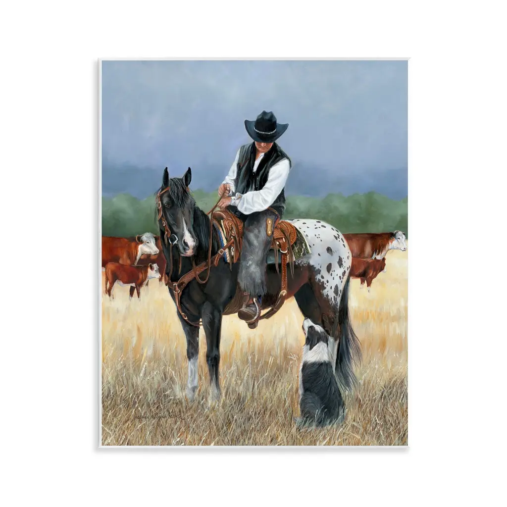 Our wall plaques start as high-quality lithograph prints mounted on durable 0.5-inch thick MDF wood. Each piece is hand finished and comes with a fresh layer of white foil on the sides to give it a crisp, clean look. Plaques arrive ready to hang without installation and come with removable plastic corners to keep them from damage in transit. Stupell Wall Art is made in the USA.Features: Dimensions: 14 x 0.5 x 11 InchesWall Art is Ready to Hang with Hardware Free Hanging. No installation required. For Easy Set Up Lean or Layer Artwork on Shelf or Against Wall.All of our wall plaques start off as high quality lithograph prints that are then mounted on durable 0.5 inch thick MDF wood. Each piece is hand finished and comes with a fresh layer of foil on the sides to give it a crisp clean look. Made In USA.Artwork Relates To: Person, Male, Man, Helmet, Animal, Mammal, Horse, Equestrian, Herd, CowboyDesign by Marilyn Hageman