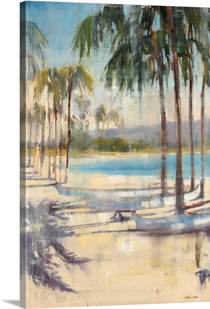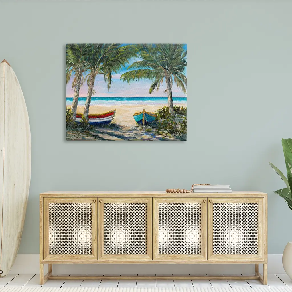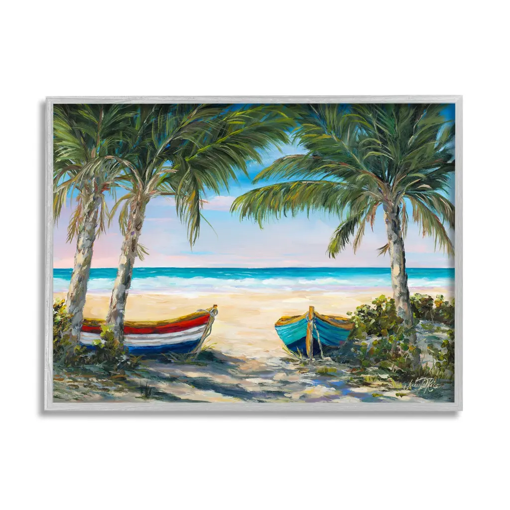 Stupell Row Boats On Beach Shore Tropical Palm Trees Canvas Wall Art - Green - 48 X 36