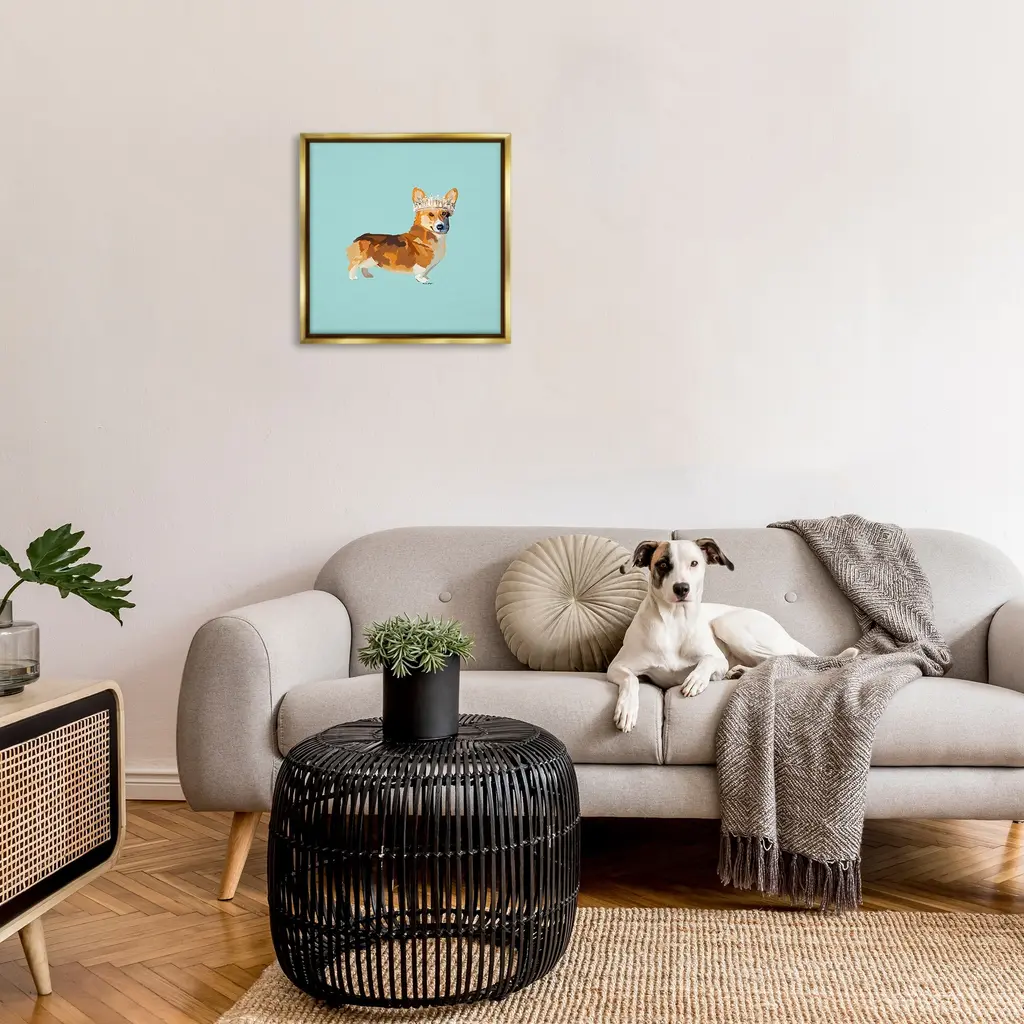 Elevate your home or office to the next level with Stupell Framed Floating Canvas Wall Art. Our premium hand-stretched canvas is mounted securely into a sturdy lightweight frame. The museum-style gap between the wrapped canvas and the box frame gives the illusion of floating artwork. Stupell Wall Art is made in the USA.Features: Dimensions: 18 x 1.7 x 18 Frame, 17 x 1.5 x 17 Canvas ArtFloating Frame Canvas Products are available in sizes 18"x18" and 25"x25". All Floating Frame Canvas Products have a 1.7" Depth.Wall Art is Ready to Hang with Hardware Free Hanging. No Installation required. For Easy Set Up Lean or Layer Artwork on Shelf or Against Wall. Artwork is Permently Fixed into the Frame.Our elevated 1.7" Thick Floating Frame is the perfect complement to our canvas style Wall Art. We use only the highest quality inks in house with industry leading printing solutions. Canvas is hand stretched over a durable wood foundation and then mounted securly into a Modern Box Frame. Made in the USA.Artwork Relates To: Animal, Canine, Dog, Mammal, Pet, Puppy, Tiara, Crown, Princess, CorgiDesign by Amelia Noyes
