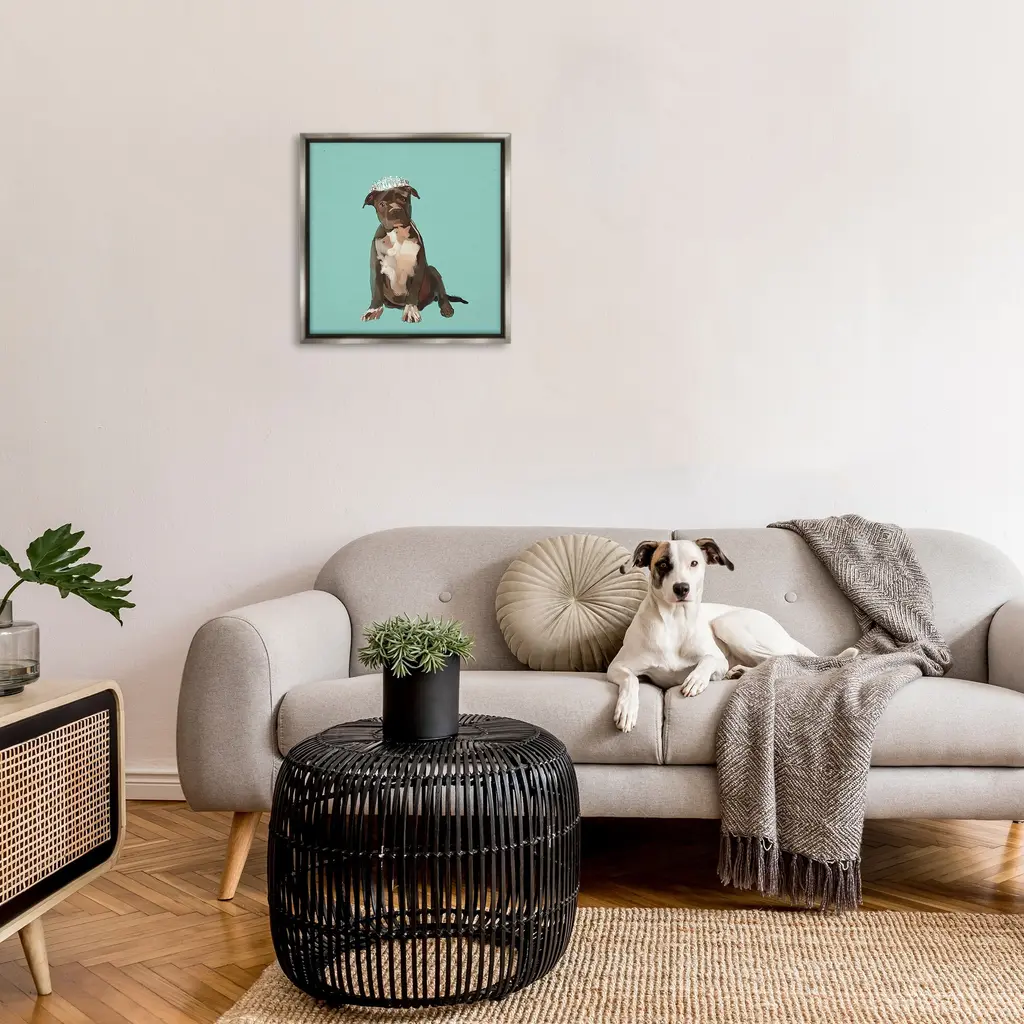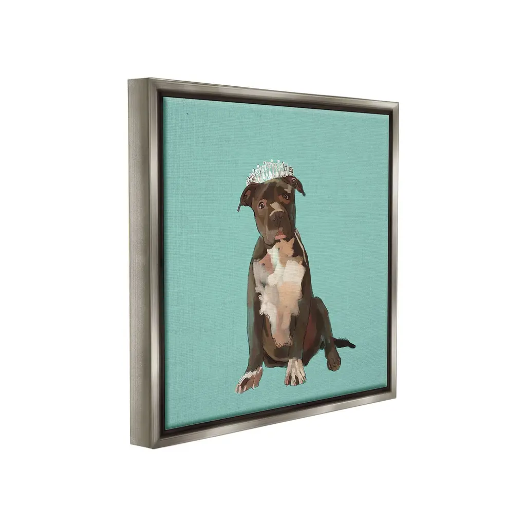 Elevate your home or office to the next level with Stupell Framed Floating Canvas Wall Art. Our premium hand-stretched canvas is mounted securely into a sturdy lightweight frame. The museum-style gap between the wrapped canvas and the box frame gives the illusion of floating artwork. Stupell Wall Art is made in the USA.Features: Dimensions: 18 x 1.7 x 18 Frame, 17 x 1.5 x 17 Canvas ArtFloating Frame Canvas Products are available in sizes 18"x18" and 25"x25". All Floating Frame Canvas Products have a 1.7" Depth.Wall Art is Ready to Hang with Hardware Free Hanging. No Installation required. For Easy Set Up Lean or Layer Artwork on Shelf or Against Wall. Artwork is Permently Fixed into the Frame.Our elevated 1.7" Thick Floating Frame is the perfect complement to our canvas style Wall Art. We use only the highest quality inks in house with industry leading printing solutions. Canvas is hand stretched over a durable wood foundation and then mounted securly into a Modern Box Frame. Made in the USA.Artwork Relates To: Animal, Canine, Dog, Mammal, Pet, Puppy, Tiara, Crown, Princess, Pit BullDesign by Amelia Noyes