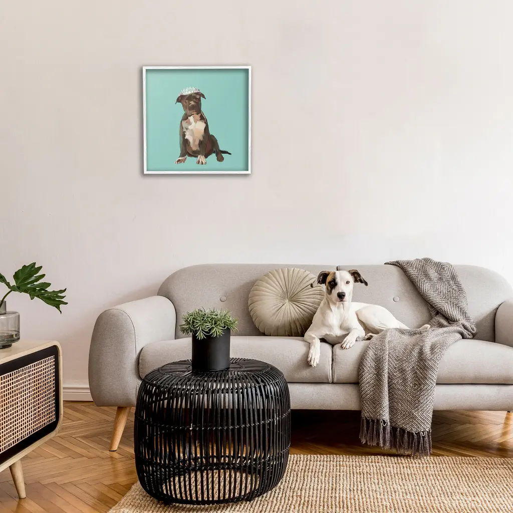 Add dimension to any room with our textured Framed Giclee Artwork. Our framed artwork is securely mounted into a 1.5-inch thick wood grain frame and ready to hang. Frames are available in three alluring styles: black, gray farmhouse and white. In addition, you should check out our oversized options if you want a statement piece. Stupell Wall Art is made in the USA.Features: Dimensions: 12 x 1.5 x 12 FramedFramed Giclee Product Sizes Include 12"x12", 17"x17", and 24"x24". Framed Giclee Products have a 1.5" Depth. Wall Art is Ready to Hang with Hardware Free Hanging. No installation required. For Easy Set Up Lean or Layer Artwork on Shelf or Against Wall.Our giclée prints are carefully mounted on a durable MDF backing, and then perfectly finished in a 1.5 inch thick woodgrain frame. Mounted frame colors include black, gray farmhouse and white. Made In USA.Artwork Relates To: Animal, Canine, Dog, Mammal, Pet, Puppy, Tiara, Crown, Princess, Pit BullDesign by Amelia Noyes