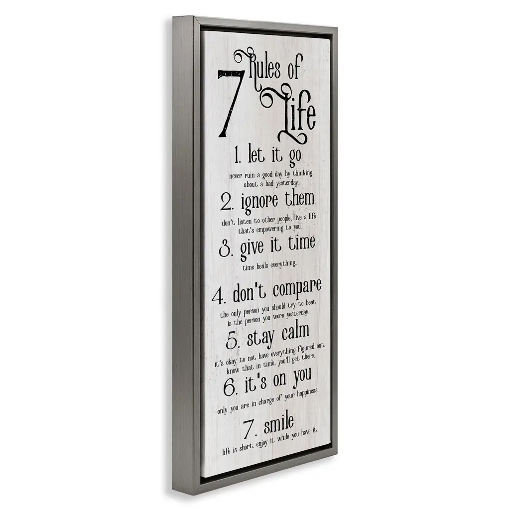 Elevate your home or office to the next level with Stupell Framed Floating Canvas Wall Art. Our premium hand-stretched canvas is mounted securely into a sturdy lightweight frame. The museum-style gap between the wrapped canvas and the box frame gives the illusion of floating artwork. Stupell Wall Art is made in the USA.Features: Dimensions: 11 x 1.7 x 25 Frame, 10 x 1.5 x 24 Canvas ArtFloating Frame Canvas Products are available in sizes 11"x25" and 14"x31". All Floating Frame Canvas Products have a 1.7" Depth.Wall Art is Ready to Hang with Hardware Free Hanging. No Installation required. For Easy Set Up Lean or Layer Artwork on Shelf or Against Wall. Artwork is Permently Fixed into the Frame.Our elevated 1.7" Thick Floating Frame is the perfect complement to our canvas style Wall Art. We use only the highest quality inks in house with industry leading printing solutions. Canvas is hand stretched over a durable wood foundation and then mounted securly into a Modern Box Frame. Made in the USA.Artwork Relates To: List, Rules, Life, Uplifting, Motivational, InspirationalDesign by Lil' Rue