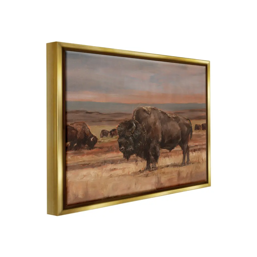Elevate your home or office to the next level with Stupell Framed Floating Canvas Wall Art. Our premium hand-stretched canvas is mounted securely into a sturdy lightweight frame. The museum-style gap between the wrapped canvas and the box frame gives the illusion of floating artwork. Stupell Wall Art is made in the USA.Features: Dimensions: 21 x 1.7 x 17 Frame, 20 x 1.5 x 16 Canvas ArtFloating Frame Canvas Products are available in sizes 21"x17" and 31"x25". All Floating Frame Canvas Products have a 1.7" Depth.Wall Art is Ready to Hang with Hardware Free Hanging. No Installation required. For Easy Set Up Lean or Layer Artwork on Shelf or Against Wall. Artwork is Permently Fixed into the Frame.Our elevated 1.7" Thick Floating Frame is the perfect complement to our canvas style Wall Art. We use only the highest quality inks in house with industry leading printing solutions. Canvas is hand stretched over a durable wood foundation and then mounted securly into a Modern Box Frame. Made in the USA.Artwork Relates To: Animal, Bison, Mammal, Wildlife, Buffalo, Cattle, Cow, Field, Grassland, Nature, LandscapeDesign by Ethan Harper