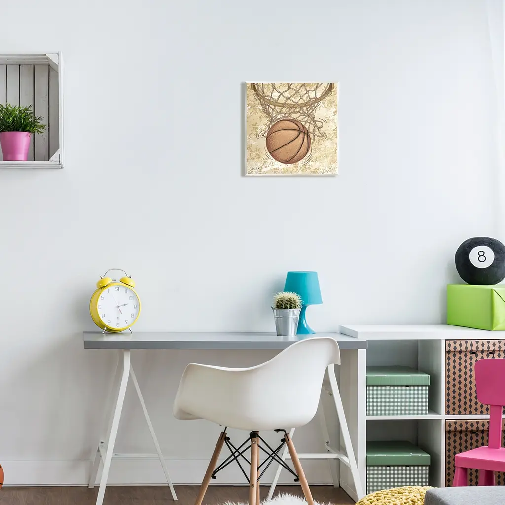 Our wall plaques start as high-quality lithograph prints mounted on durable 0.5-inch thick MDF wood. Each piece is hand finished and comes with a fresh layer of white foil on the sides to give it a crisp, clean look. Plaques arrive ready to hang without installation and come with removable plastic corners to keep them from damage in transit. Stupell Wall Art is made in the USA.Features: Dimensions: 12 x 0.5 x 12 InchesWall Art is Ready to Hang with Hardware Free Hanging. No installation required. For Easy Set Up Lean or Layer Artwork on Shelf or Against Wall.All of our wall plaques start off as high quality lithograph prints that are then mounted on durable 0.5 inch thick MDF wood. Each piece is hand finished and comes with a fresh layer of foil on the sides to give it a crisp clean look. Made In USA.Artwork Relates To: Ball, Basketball, Hoop, SportDesign by Nidhi Wadhwa