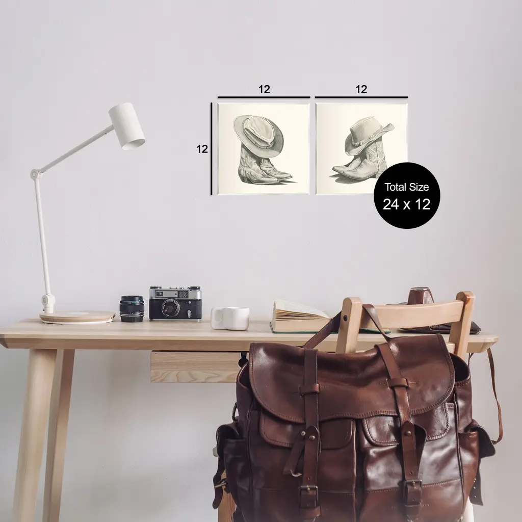 Fill any space with Stupell Wall Art Sets. Our wall plaques start as high-quality lithograph prints mounted on durable 0.5-inch thick MDF wood. Each piece is hand finished and comes with a fresh layer of white foil on the sides to give it a crisp, clean look. Plaques arrive ready to hang without installation and come with removable plastic corners to keep them from damage in transit. Stupell Wall Art is made in the USA.Features: Dimensions: 2 Piece Set, Each Panel is 12 x 0.5 x 12 InchesWall Art is Ready to Hang with Hardware Free Hanging. No installation required. For Easy Set Up Lean or Layer Artwork on Shelf or Against Wall.All of our wall plaques start off as high quality lithograph prints that are then mounted on durable 0.5 inch thick MDF wood. Each piece is hand finished and comes with a fresh layer of foil on the sides to give it a crisp clean look. Made In USA.Artwork Relates To: Hat, Drawing, Cowboy Boots, Cowboy Hat, Rustic, Rodeo, SouthwesternDesign by Grace Popp