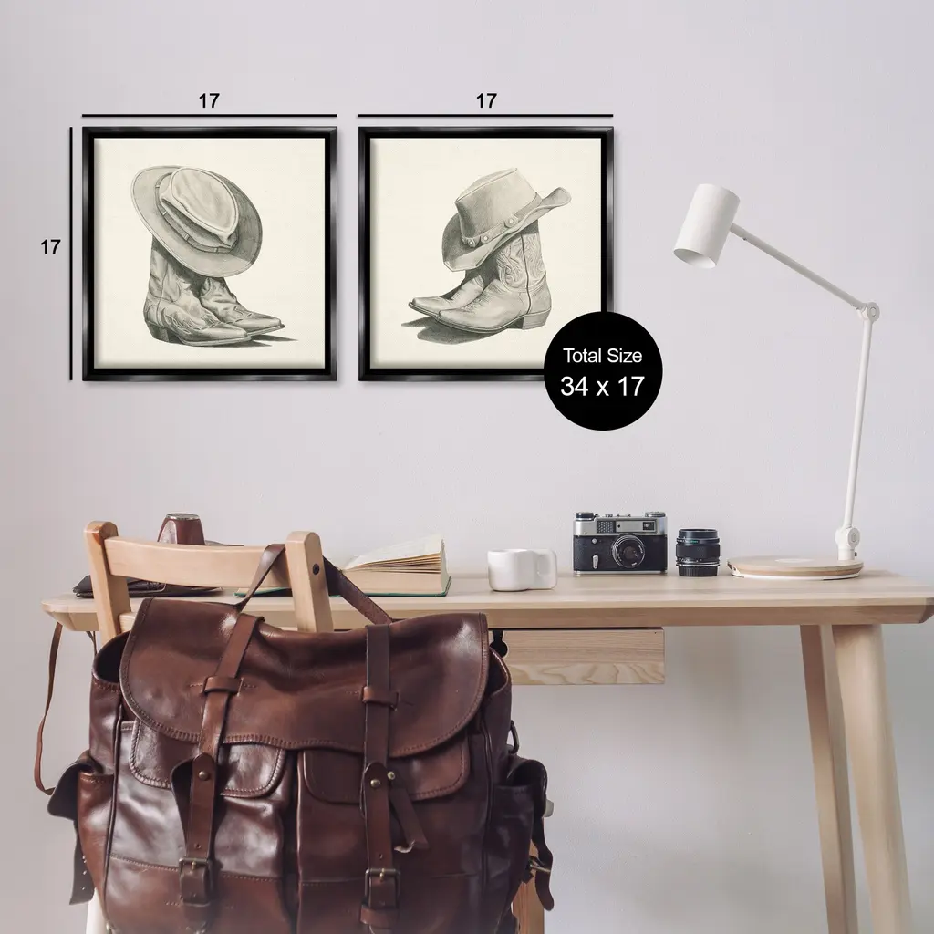 Elevate your home or office to the next level with Stupell Framed Floating Canvas Wall Art. Our premium hand-stretched canvas is mounted securely into a sturdy lightweight frame. The museum-style gap between the wrapped canvas and the box frame gives the illusion of floating artwork. Stupell Wall Art is made in the USA.Features: Dimensions: 2 Piece Set, Each Frame is 18 x 1.7 x 18Two Piece Floating Frame Canvas Products are available as 18"x18" or 25"x25" Panels. All Floating Frame Canvas Products have a 1.7" Depth.Wall Art is Ready to Hang with Hardware Free Hanging. No Installation required. For Easy Set Up Lean or Layer Artwork on Shelf or Against Wall. Artwork is Permently Fixed into the Frame.Our elevated 1.7" Thick Floating Frame is the perfect complement to our canvas style Wall Art. We use only the highest quality inks in house with industry leading printing solutions. Canvas is hand stretched over a durable wood foundation and then mounted securly into a Modern Box Frame. Made in the USA.Artwork Relates To: Hat, Drawing, Cowboy Boots, Cowboy Hat, Rustic, Rodeo, SouthwesternDesign by Grace Popp