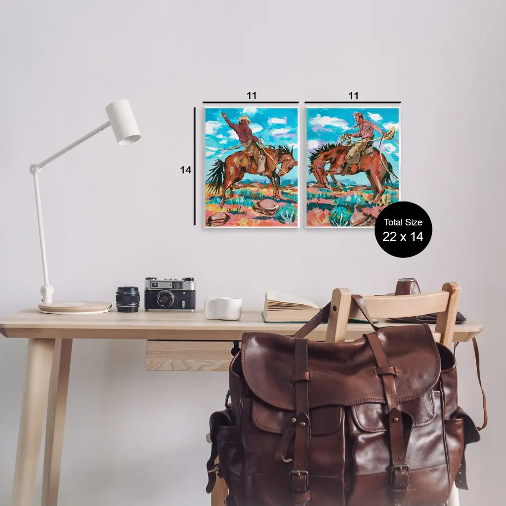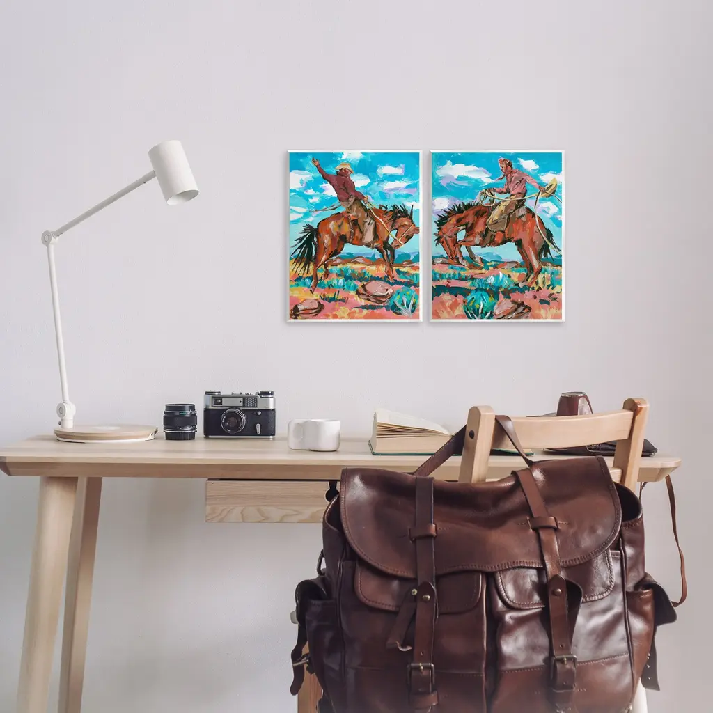 Fill any space with Stupell Wall Art Sets. Our wall plaques start as high-quality lithograph prints mounted on durable 0.5-inch thick MDF wood. Each piece is hand finished and comes with a fresh layer of white foil on the sides to give it a crisp, clean look. Plaques arrive ready to hang without installation and come with removable plastic corners to keep them from damage in transit. Stupell Wall Art is made in the USA.Features: Dimensions: 2 Piece Set, Each Panel is 11 x 0.5 x 14 InchesWall Art is Ready to Hang with Hardware Free Hanging. No installation required. For Easy Set Up Lean or Layer Artwork on Shelf or Against Wall.All of our wall plaques start off as high quality lithograph prints that are then mounted on durable 0.5 inch thick MDF wood. Each piece is hand finished and comes with a fresh layer of foil on the sides to give it a crisp clean look. Made In USA.Artwork Relates To: Animal, Person, Cowboy, Modern, Landscape, WesternDesign by Melissa Wang