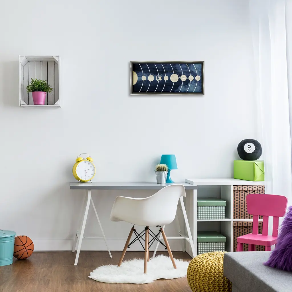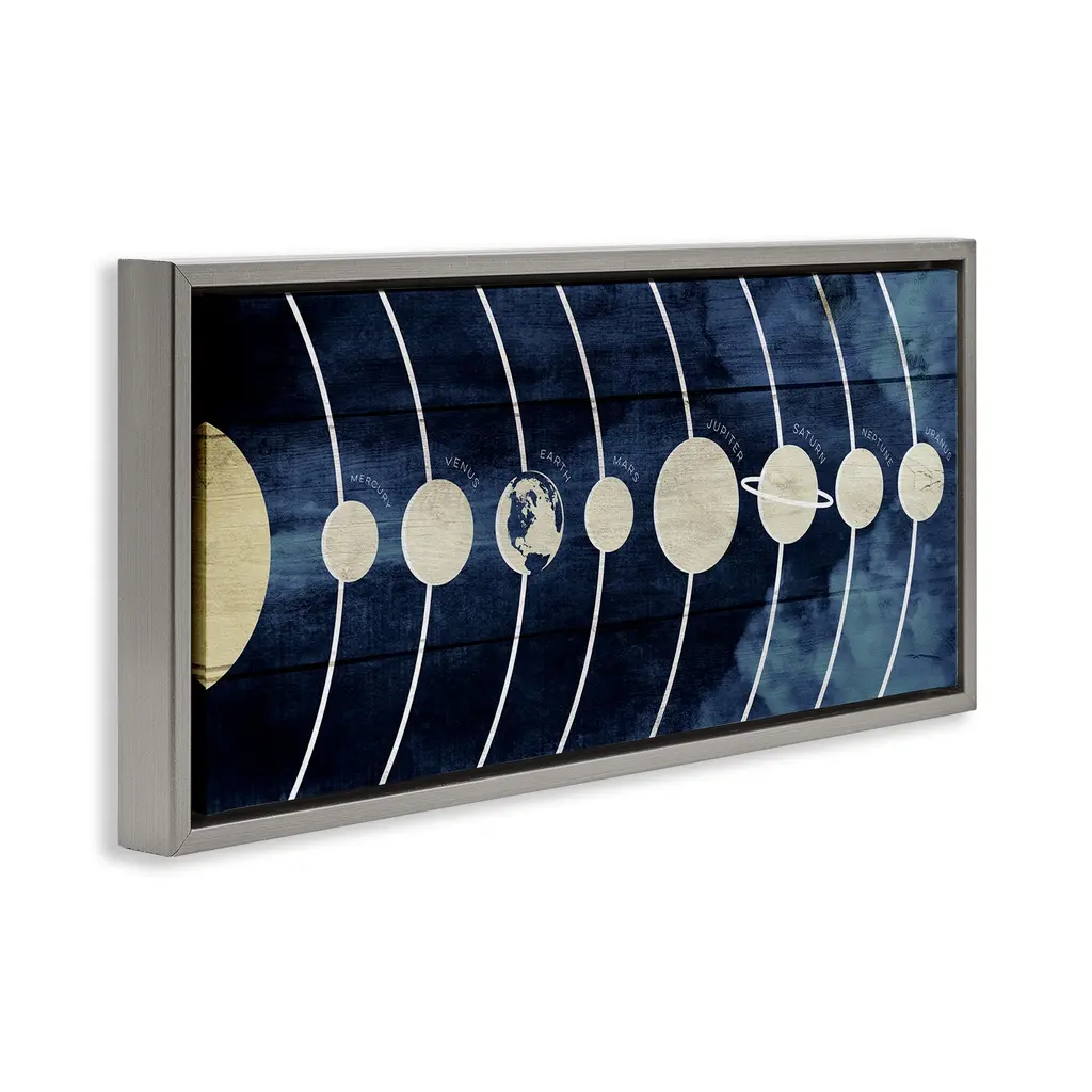 Elevate your home or office to the next level with Stupell Framed Floating Canvas Wall Art. Our premium hand-stretched canvas is mounted securely into a sturdy lightweight frame. The museum-style gap between the wrapped canvas and the box frame gives the illusion of floating artwork. Stupell Wall Art is made in the USA.Features: Dimensions: 25 x 1.7 x 11 Frame, 24 x 1.5 x 10 Canvas ArtFloating Frame Canvas Products are available in sizes 25"x11" and 31"x14". All Floating Frame Canvas Products have a 1.7" Depth.Wall Art is Ready to Hang with Hardware Free Hanging. No Installation required. For Easy Set Up Lean or Layer Artwork on Shelf or Against Wall. Artwork is Permently Fixed into the Frame.Our elevated 1.7" Thick Floating Frame is the perfect complement to our canvas style Wall Art. We use only the highest quality inks in house with industry leading printing solutions. Canvas is hand stretched over a durable wood foundation and then mounted securly into a Modern Box Frame. Made in the USA.Artwork Relates To: Outer Space, Planets, Solar System, Educational, KidsDesign by Daphne Polselli