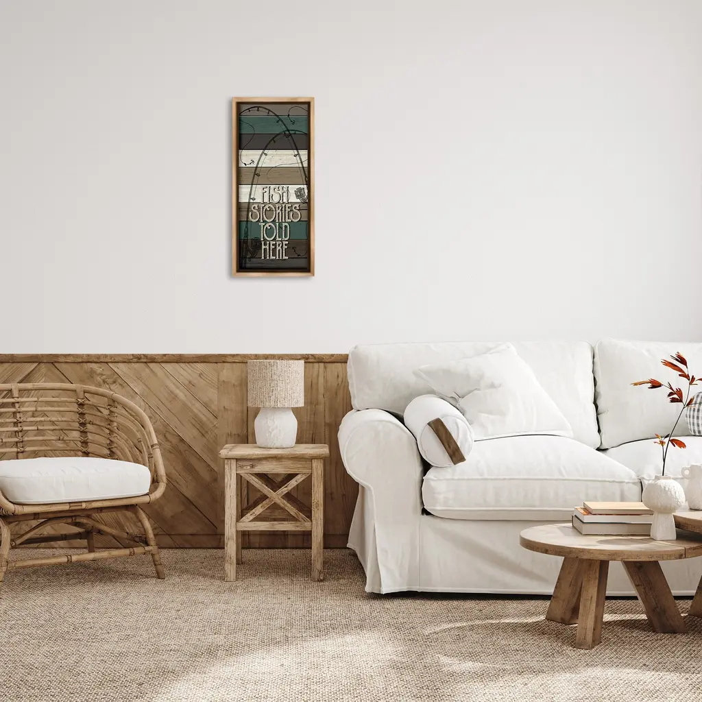 Elevate your home or office to the next level with Stupell Framed Floating Canvas Wall Art. Our premium hand-stretched canvas is mounted securely into a sturdy lightweight frame. The museum-style gap between the wrapped canvas and the box frame gives the illusion of floating artwork. Stupell Wall Art is made in the USA.Features: Dimensions: 11 x 1.7 x 25 Frame, 10 x 1.5 x 24 Canvas ArtFloating Frame Canvas Products are available in sizes 11"x25" and 14"x31". All Floating Frame Canvas Products have a 1.7" Depth.Wall Art is Ready to Hang with Hardware Free Hanging. No Installation required. For Easy Set Up Lean or Layer Artwork on Shelf or Against Wall. Artwork is Permently Fixed into the Frame.Our elevated 1.7" Thick Floating Frame is the perfect complement to our canvas style Wall Art. We use only the highest quality inks in house with industry leading printing solutions. Canvas is hand stretched over a durable wood foundation and then mounted securly into a Modern Box Frame. Made in the USA.Artwork Relates To: Rustic, Cabin, Lodge, Lake House, Fishing, Pattern, HumorDesign by Kim Allen