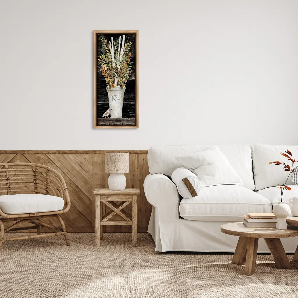 Elevate your home or office to the next level with Stupell Framed Floating Canvas Wall Art. Our premium hand-stretched canvas is mounted securely into a sturdy lightweight frame. The museum-style gap between the wrapped canvas and the box frame gives the illusion of floating artwork. Stupell Wall Art is made in the USA.Features: Dimensions: 11 x 1.7 x 25 Frame, 10 x 1.5 x 24 Canvas ArtFloating Frame Canvas Products are available in sizes 11"x25" and 14"x31". All Floating Frame Canvas Products have a 1.7" Depth.Wall Art is Ready to Hang with Hardware Free Hanging. No Installation required. For Easy Set Up Lean or Layer Artwork on Shelf or Against Wall. Artwork is Permently Fixed into the Frame.Our elevated 1.7" Thick Floating Frame is the perfect complement to our canvas style Wall Art. We use only the highest quality inks in house with industry leading printing solutions. Canvas is hand stretched over a durable wood foundation and then mounted securly into a Modern Box Frame. Made in the USA.Artwork Relates To: Flower, Floral, Bouquet, Country, Sill Life, Botanical, Bird, Animal, Rustic, FallDesign by Cindy Jacobs