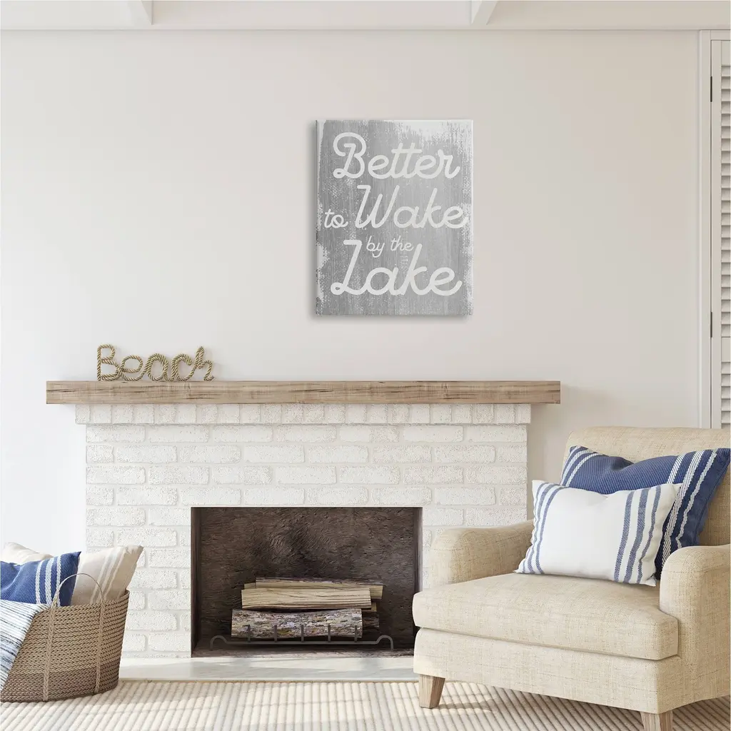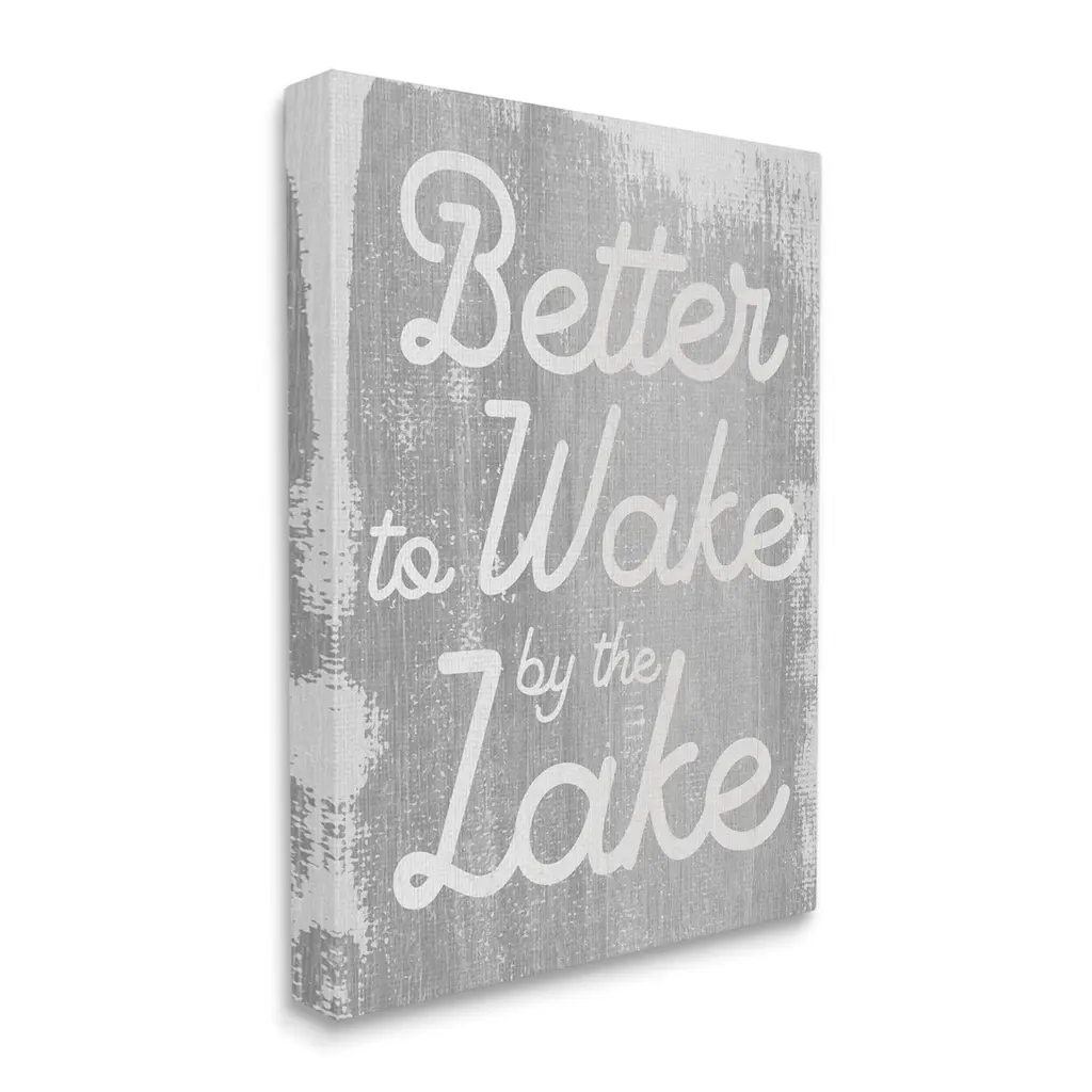 We create our stretched canvas to the highest standards. Using only the highest quality inks and canvas on Mimaki printers, we hand-cut and stretch each piece over a 1.5-inch thick wooden frame for hanging. As a result, the art comes ready to hang on the sturdy ledge with no installation required. Stupell Wall Art is made in the USA.Features: Dimensions: 16 x 1.5 x 20 InchesStretched Canvas Sizes Include Standard: 16 x 1.5 x 20 Large: 20 x 1.5 x 30 X-Large: 30 x 1.5 x 40 Oversized: 36 x 1.5 x 48Wall Art is Ready to Hang with Hardware Free Hanging. No installation required. For Easy Set Up Lean or Layer Artwork on Shelf or Against Wall.Our stretched canvas is created with the highest standards. We use only the highest quality inks and canvas on our in house Mimaki printers, and then hand cut and stretch each piece over a 1.5 inch thick wooden frame for hanging. Made In USA.Artwork Relates To: Phrase, Rustic, Phrase, Lake house, Better to Wake by the LakeDesign by Lil' Rue