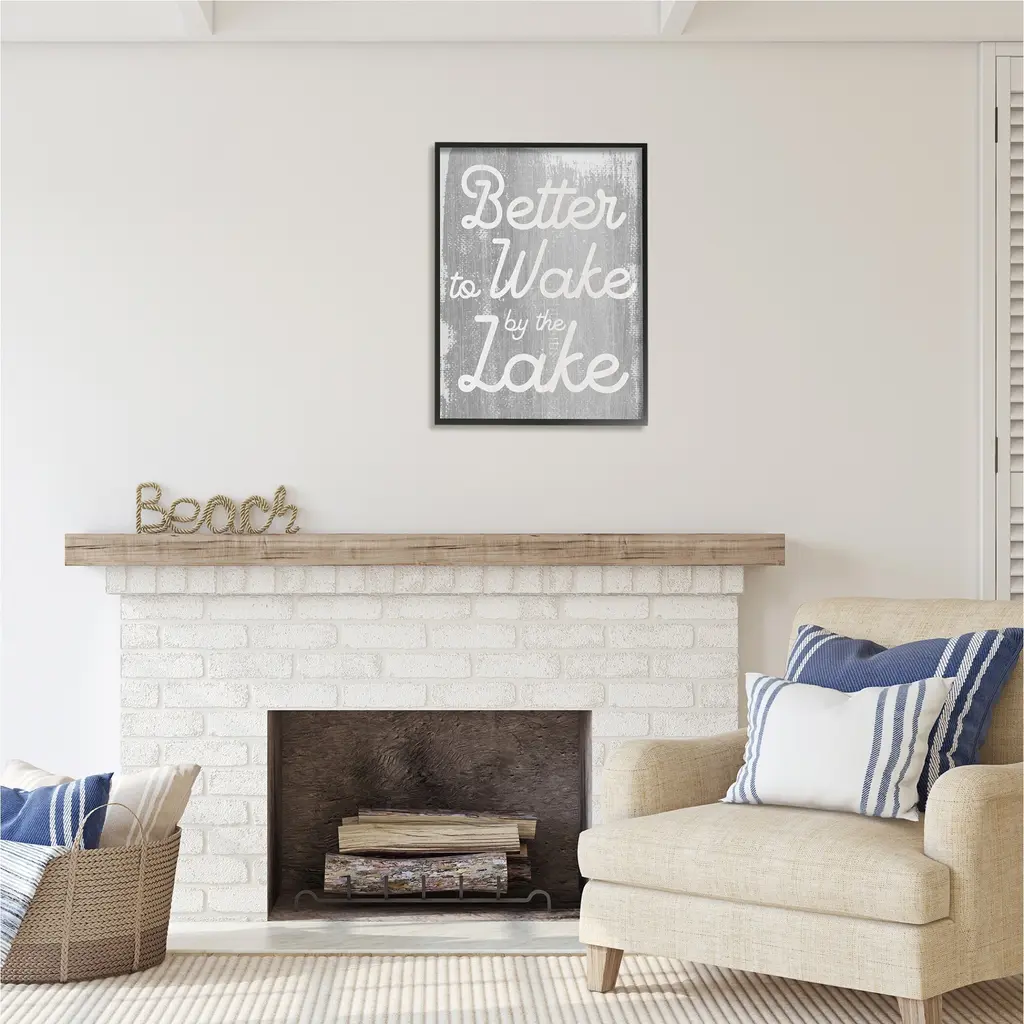 Add dimension to any room with our textured Framed Giclee Artwork. Our framed artwork is securely mounted into a 1.5-inch thick wood grain frame and ready to hang. Frames are available in three alluring styles: black, gray farmhouse and white. In addition, you should check out our oversized options if you want a statement piece. Stupell Wall Art is made in the USA.Features: Dimensions: 11 x 1.5 x 14 FramedFramed Giclee Sizes Include Standard: 11 x 1.5 x 14 Large: 16 x 1.5 x 20 Oversized: 24 x 1.5 x 30Wall Art is Ready to Hang with Hardware Free Hanging. No installation required. For Easy Set Up Lean or Layer Artwork on Shelf or Against Wall.Our giclée prints are carefully mounted on a durable MDF backing, and then perfectly finished in a 1.5 inch thick woodgrain frame. Mounted frame colors include black, gray farmhouse and white. Made In USA.Artwork Relates To: Phrase, Rustic, Phrase, Lake house, Better to Wake by the LakeDesign by Lil' Rue