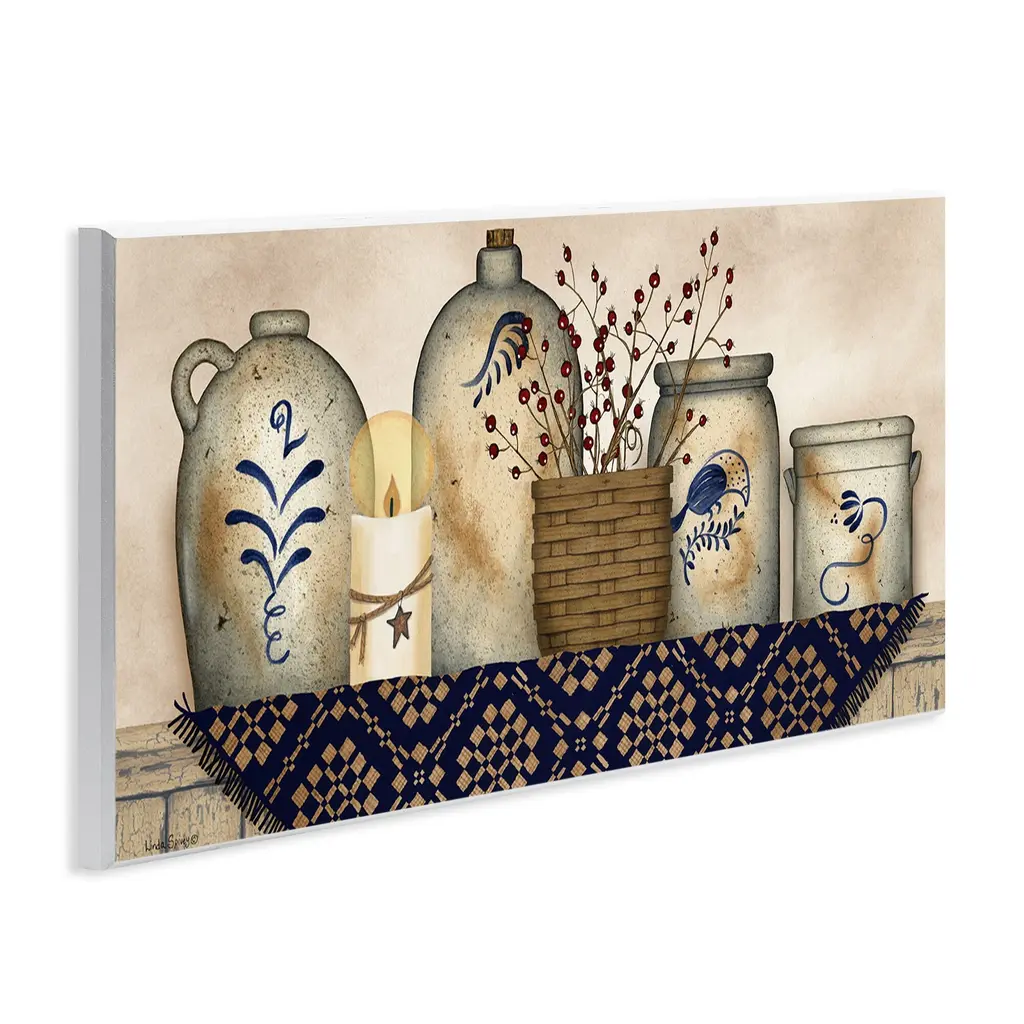 Our wall plaques start as high-quality lithograph prints mounted on durable 0.5-inch thick MDF wood. Each piece is hand finished and comes with a fresh layer of white foil on the sides to give it a crisp, clean look. Plaques arrive ready to hang without installation and come with removable plastic corners to keep them from damage in transit. Stupell Wall Art is made in the USA.Features: Dimensions: 17 x 0.5 x 7 InchesWall Art is Ready to Hang with Hardware Free Hanging. No installation required. For Easy Set Up Lean or Layer Artwork on Shelf or Against Wall.All of our wall plaques start off as high quality lithograph prints that are then mounted on durable 0.5 inch thick MDF wood. Each piece is hand finished and comes with a fresh layer of foil on the sides to give it a crisp clean look. Made In USA.Artwork Relates To: Pottery, Cookware, Jar, Country, Rustic, Vase, Still LifeDesign by Linda Spivey