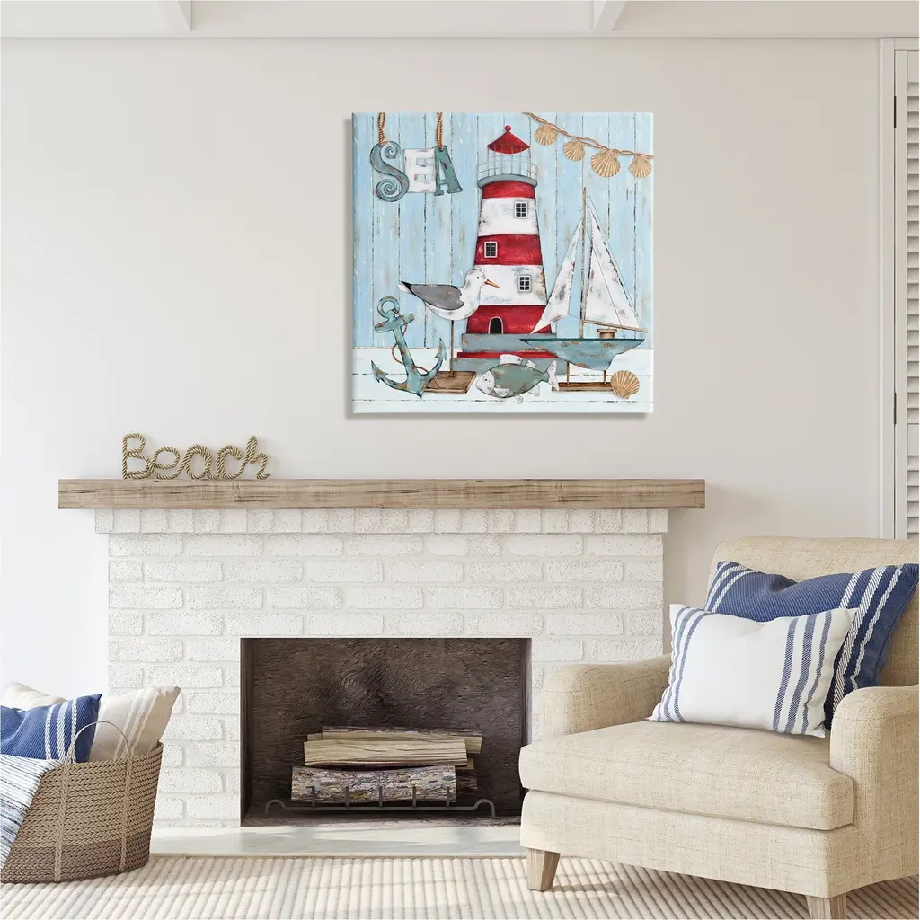 We create our stretched canvas to the highest standards. Using only the highest quality inks and canvas on Mimaki printers, we hand-cut and stretch each piece over a 1.5-inch thick wooden frame for hanging. As a result, the art comes ready to hang on the sturdy ledge with no installation required. Stupell Wall Art is made in the USA.Features: Dimensions: 17 x 1.5 x 17 InchesStretched Canvas Sizes Include Standard: 17 x 1.5 x 17 Large: 24 x 1.5 x 24 X-Large: 30 x 1.5 x 30 Oversized: 36 x 1.5 x 36Wall Art is Ready to Hang with Hardware Free Hanging. No installation required. For Easy Set Up Lean or Layer Artwork on Shelf or Against Wall.Our stretched canvas is created with the highest standards. We use only the highest quality inks and canvas on our in house Mimaki printers, and then hand cut and stretch each piece over a 1.5 inch thick wooden frame for hanging. Made In USA.Artwork Relates To: Fish, Sailboat, Seagull, Seashell, Nautical, Maritime, Beacon, Lighthouse, SeaDesign by Emma Leach