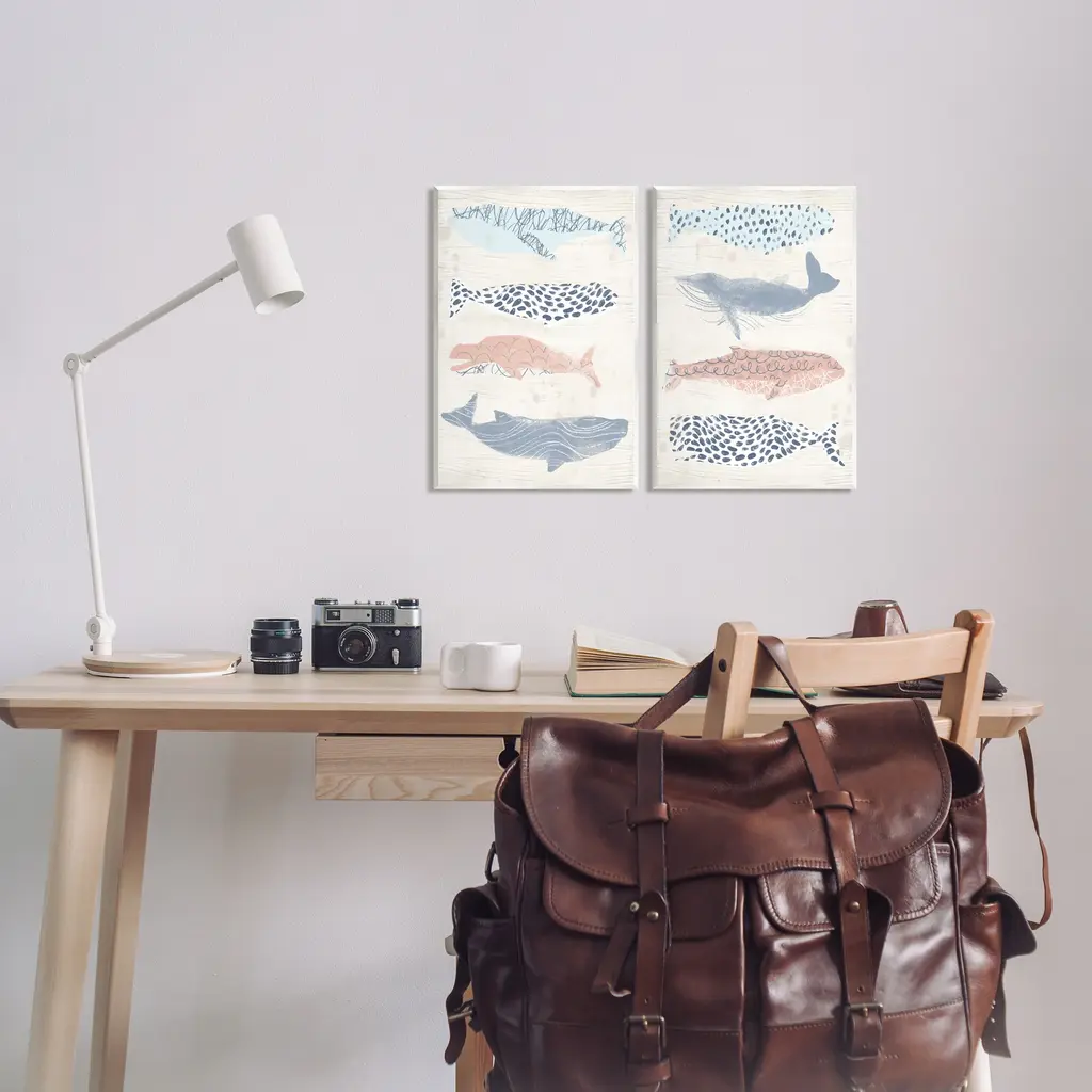 Fill any space with Stupell Wall Art Sets. Our wall plaques start as high-quality lithograph prints mounted on durable 0.5-inch thick MDF wood. Each piece is hand finished and comes with a fresh layer of white foil on the sides to give it a crisp, clean look. Plaques arrive ready to hang without installation and come with removable plastic corners to keep them from damage in transit. Stupell Industries Wall Art is made in the USA.Features: Dimensions: 2 Piece Set, Each Panel is 10 x 0.5 x 15 InchesWall Plaque Set Sizes Include Standard: 2pc, Each is 10 x 0.5 x 15 Oversized: 2pc, Each is 13 x 0.5 x 19Wall Art is Ready to Hang with Hardware Free Hanging. No installation required. For Easy Set Up Lean or Layer Artwork on Shelf or Against Wall.All of our wall plaques start off as high quality lithograph prints that are then mounted on durable 0.5 inch thick MDF wood. Each piece is hand finished and comes with a fresh layer of foil on the sides to give it a crisp clean look. Made In USA.Artwork Relates To: Animal, Mammal, Sea Life, Whale, Fish, PatternDesign by June Erica Vess