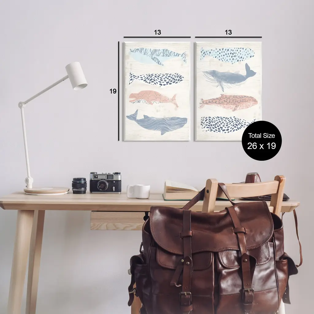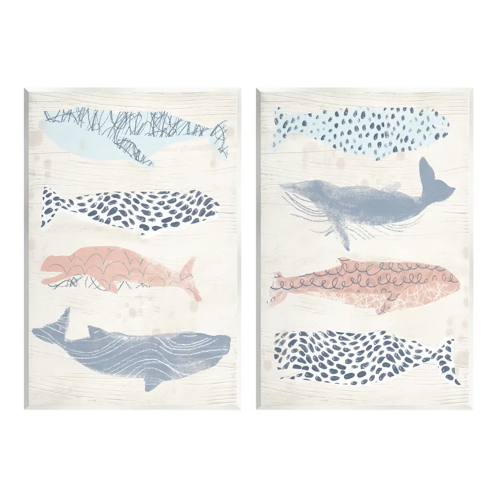 Fill any space with Stupell Wall Art Sets. Our wall plaques start as high-quality lithograph prints mounted on durable 0.5-inch thick MDF wood. Each piece is hand finished and comes with a fresh layer of white foil on the sides to give it a crisp, clean look. Plaques arrive ready to hang without installation and come with removable plastic corners to keep them from damage in transit. Stupell Industries Wall Art is made in the USA.Features: Dimensions: 2 Piece Set, Each Panel is 10 x 0.5 x 15 InchesWall Plaque Set Sizes Include Standard: 2pc, Each is 10 x 0.5 x 15 Oversized: 2pc, Each is 13 x 0.5 x 19Wall Art is Ready to Hang with Hardware Free Hanging. No installation required. For Easy Set Up Lean or Layer Artwork on Shelf or Against Wall.All of our wall plaques start off as high quality lithograph prints that are then mounted on durable 0.5 inch thick MDF wood. Each piece is hand finished and comes with a fresh layer of foil on the sides to give it a crisp clean look. Made In USA.Artwork Relates To: Animal, Mammal, Sea Life, Whale, Fish, PatternDesign by June Erica Vess
