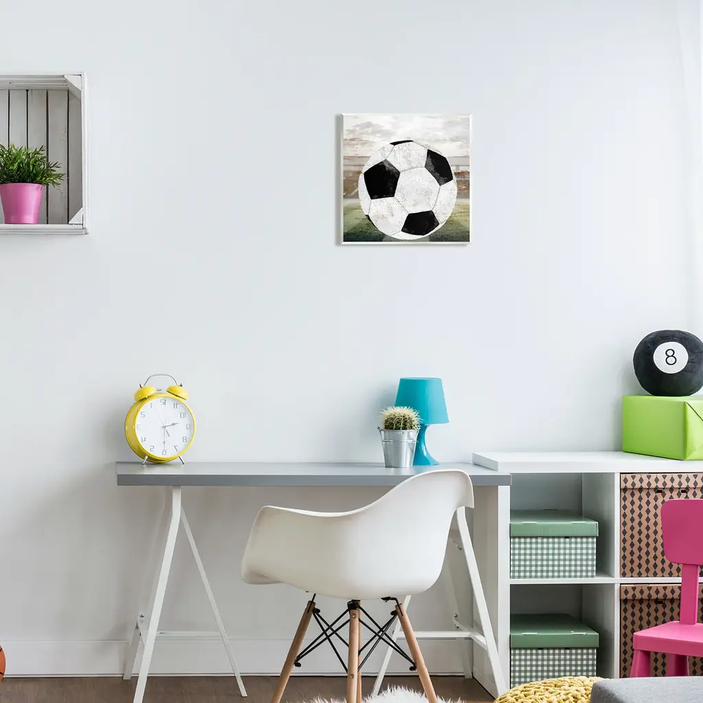 Our wall plaques start as high-quality lithograph prints mounted on durable 0.5-inch thick MDF wood. Each piece is hand finished and comes with a fresh layer of white foil on the sides to give it a crisp, clean look. Plaques arrive ready to hang without installation and come with removable plastic corners to keep them from damage in transit. Wall Art is made in the USA.Features: Dimensions: 12 x 0.5 x 12 InchesWall Art is Ready to Hang with Hardware Free Hanging. No installation required. For Easy Set Up Lean or Layer Artwork on Shelf or Against Wall.All of our wall plaques start off as high quality lithograph prints that are then mounted on durable 0.5 inch thick MDF wood. Each piece is hand finished and comes with a fresh layer of foil on the sides to give it a crisp clean look. Made In USA.Artwork Relates To: Ball, Soccer, Soccer Ball, Sport, Abstract, RusticDesign by Kim Allen