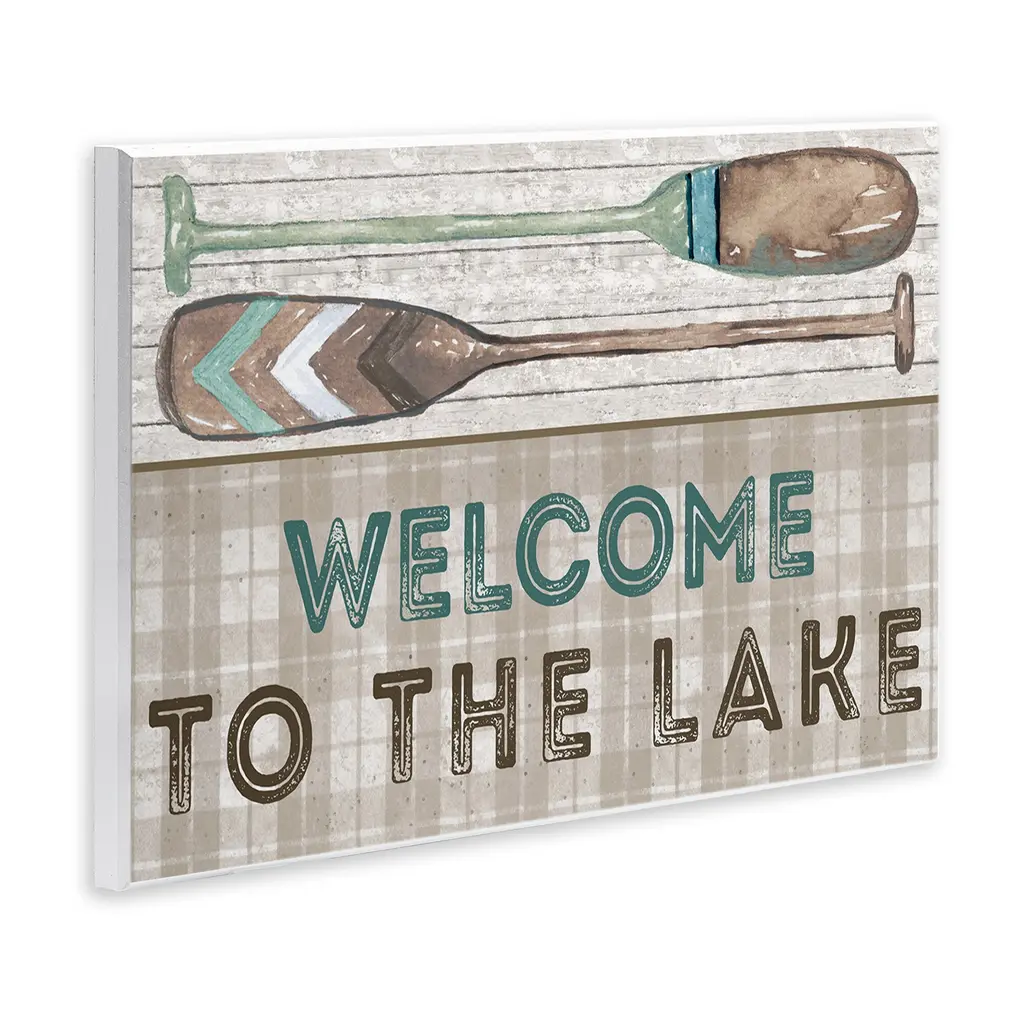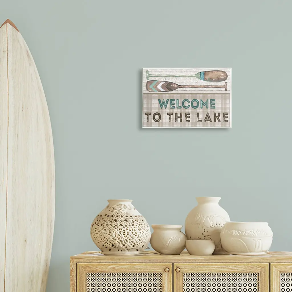 Our wall plaques start as high-quality lithograph prints mounted on durable 0.5-inch thick MDF wood. Each piece is hand finished and comes with a fresh layer of white foil on the sides to give it a crisp, clean look. Plaques arrive ready to hang without installation and come with removable plastic corners to keep them from damage in transit. Stupell Wall Art is made in the USA.Features: Dimensions: 15 x 0.5 x 10 InchesWall Plaque Product Sizes Include 15"x10" and 19"x13". All wall plaque products have a 0.5" Depth. Wall Art is Ready to Hang with Hardware Free Hanging. No installation required. For Easy Set Up Lean or Layer Artwork on Shelf or Against Wall.All of our wall plaques start off as high quality lithograph prints that are then mounted on durable 0.5 inch thick MDF wood. Each piece is hand finished and comes with a fresh layer of foil on the sides to give it a crisp clean look. Made In USA.Artwork Relates To: Oars, Paddle, Boat, Lake, Rustic, Welcome, SignDesign by Elizabeth Medley