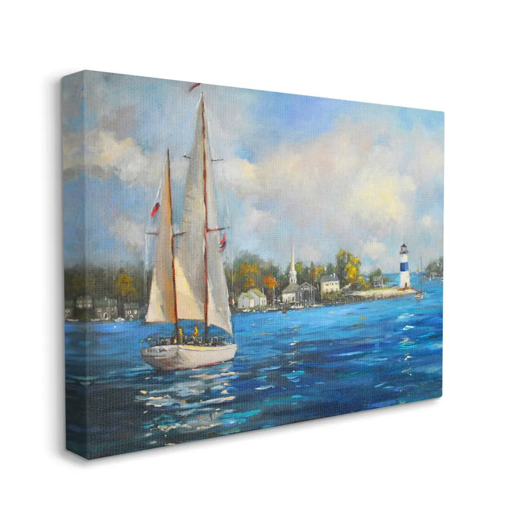 We create our stretched canvas to the highest standards. Using only the highest quality inks and canvas on Mimaki printers, we hand-cut and stretch each piece over a 1.5-inch thick wooden frame for hanging. As a result, the art comes ready to hang on the sturdy ledge with no installation required. Stupell Wall Art is made in the USA.Features: Dimensions: 20 x 1.5 x 16 InchesStretched Canvas Sizes Include Standard: 20 x 1.5 x 16 Large: 30 x 1.5 x 20 X-Large: 40 x 1.5 x 30 Oversized: 48 x 1.5 x 36Wall Art is Ready to Hang with Hardware Free Hanging. No installation required. For Easy Set Up Lean or Layer Artwork on Shelf or Against Wall.Our stretched canvas is created with the highest standards. We use only the highest quality inks and canvas on our in house Mimaki printers, and then hand cut and stretch each piece over a 1.5 inch thick wooden frame for hanging. Made In USA.Artwork Relates To: Boat, Sailboat, Transportation, Vehicle, Painting, Lighthouse, Water, WaterfrontDesign by Allayn Stevens