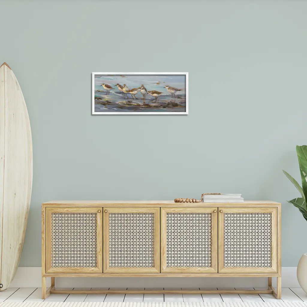 Stupell Sandpiper Flock On Shore Framed Giclee Art Design By Sandy Nelson - 30 X 13 - White