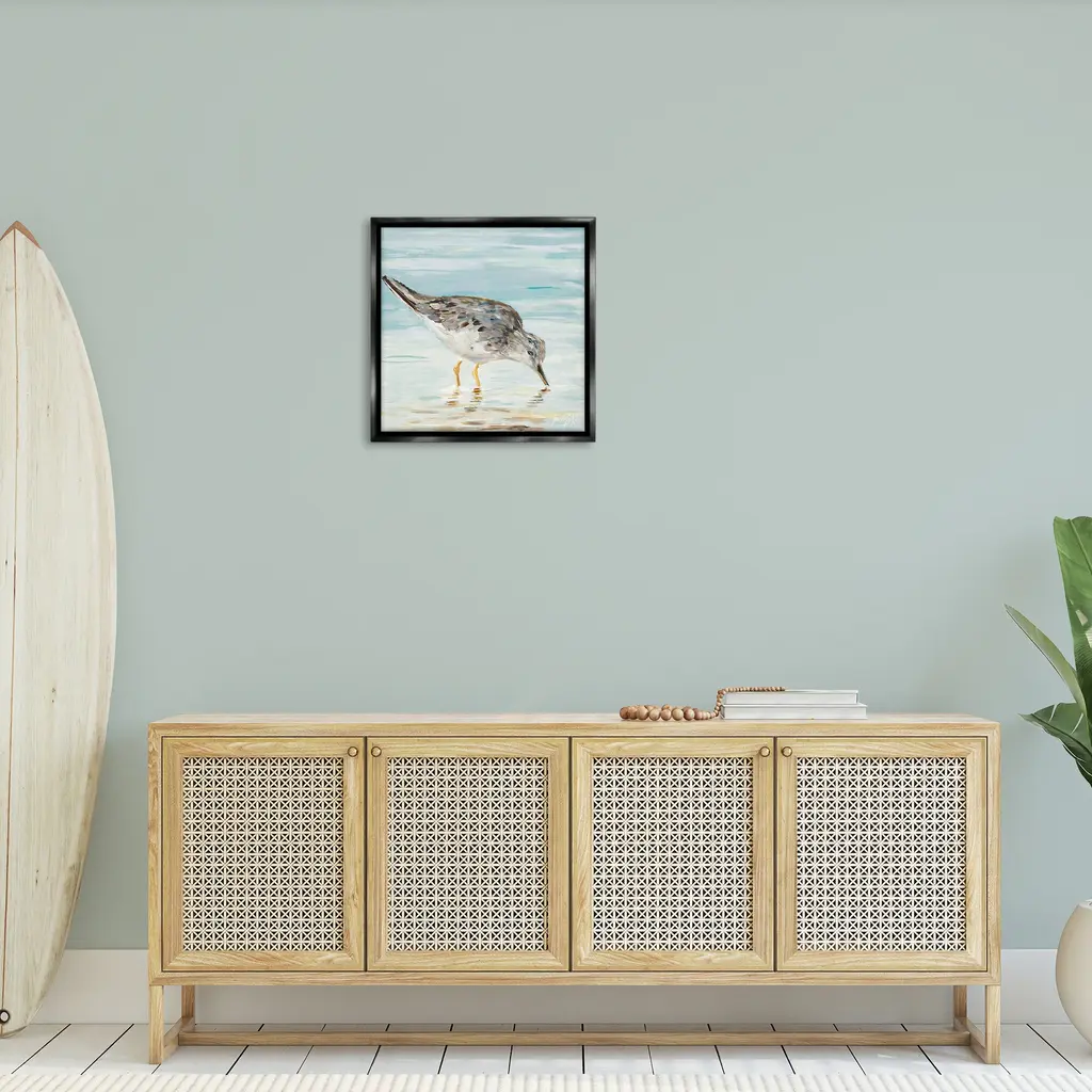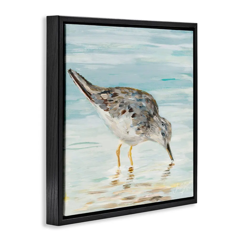 Elevate your home or office to the next level with Stupell Framed Floating Canvas Wall Art. Our premium hand-stretched canvas is mounted securely into a sturdy lightweight frame. The museum-style gap between the wrapped canvas and the box frame gives the illusion of floating artwork. Stupell Wall Art is made in the USA.Features: Dimensions: 18 x 1.7 x 18 Frame, 17 x 1.5 x 17 Canvas ArtFloating Frame Canvas Products are available in sizes 18"x18" and 25"x25". All Floating Frame Canvas Products have a 1.7" Depth.Wall Art is Ready to Hang with Hardware Free Hanging. No Installation required. For Easy Set Up Lean or Layer Artwork on Shelf or Against Wall. Artwork is Permently Fixed into the Frame.Our elevated 1.7" Thick Floating Frame is the perfect complement to our canvas style Wall Art. We use only the highest quality inks in house with industry leading printing solutions. Canvas is hand stretched over a durable wood foundation and then mounted securly into a Modern Box Frame. Made in the USA.Artwork Relates To: Animal, Bird, Sandpiper, Beach, NauticalDesign by Julie DeRice