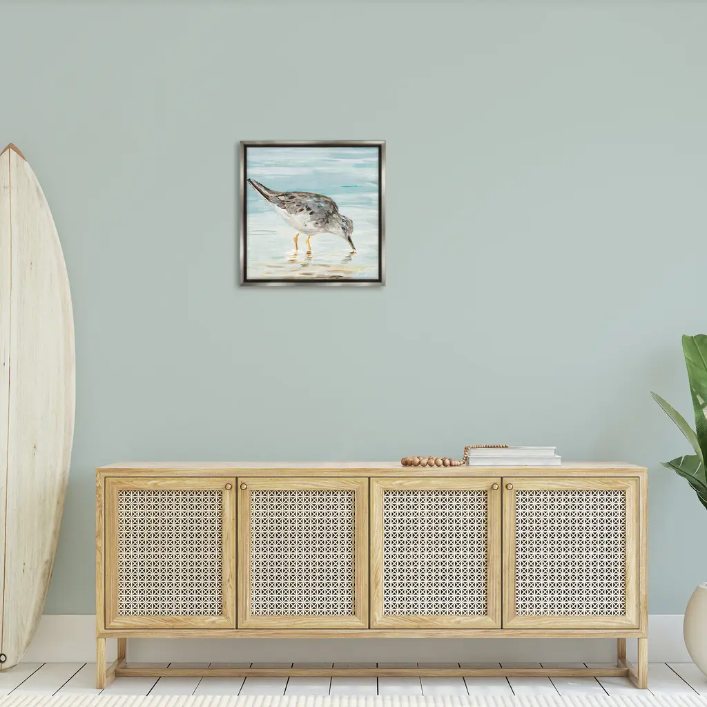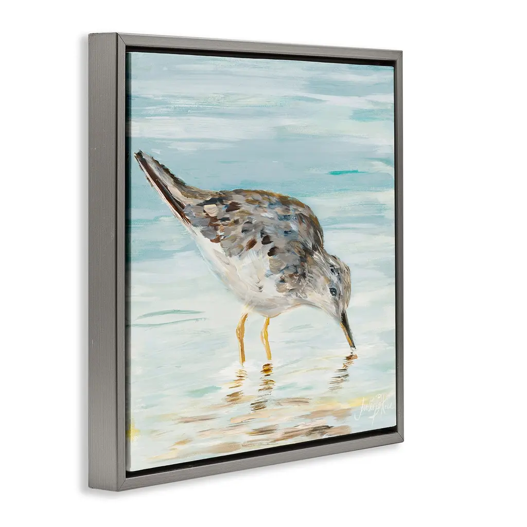 Elevate your home or office to the next level with Stupell Framed Floating Canvas Wall Art. Our premium hand-stretched canvas is mounted securely into a sturdy lightweight frame. The museum-style gap between the wrapped canvas and the box frame gives the illusion of floating artwork. Stupell Wall Art is made in the USA.Features: Dimensions: 18 x 1.7 x 18 Frame, 17 x 1.5 x 17 Canvas ArtFloating Frame Canvas Products are available in sizes 18"x18" and 25"x25". All Floating Frame Canvas Products have a 1.7" Depth.Wall Art is Ready to Hang with Hardware Free Hanging. No Installation required. For Easy Set Up Lean or Layer Artwork on Shelf or Against Wall. Artwork is Permently Fixed into the Frame.Our elevated 1.7" Thick Floating Frame is the perfect complement to our canvas style Wall Art. We use only the highest quality inks in house with industry leading printing solutions. Canvas is hand stretched over a durable wood foundation and then mounted securly into a Modern Box Frame. Made in the USA.Artwork Relates To: Animal, Bird, Sandpiper, Beach, NauticalDesign by Julie DeRice