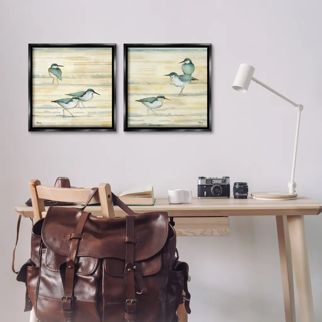 Elevate your home or office to the next level with Stupell Framed Floating Canvas Wall Art. Our premium hand-stretched canvas is mounted securely into a sturdy lightweight frame. The museum-style gap between the wrapped canvas and the box frame gives the illusion of floating artwork. Stupell Wall Art is made in the USA.Features: Dimensions: 2 Piece Set, Each Frame is 18 x 1.7 x 18Two Piece Floating Frame Canvas Products are available as 18"x18" or 25"x25" Panels. All Floating Frame Canvas Products have a 1.7" Depth.Wall Art is Ready to Hang with Hardware Free Hanging. No Installation required. For Easy Set Up Lean or Layer Artwork on Shelf or Against Wall. Artwork is Permently Fixed into the Frame.Our elevated 1.7" Thick Floating Frame is the perfect complement to our canvas style Wall Art. We use only the highest quality inks in house with industry leading printing solutions. Canvas is hand stretched over a durable wood foundation and then mounted securly into a Modern Box Frame. Made in the USA.Artwork Relates To: Bird, Animal, Sea, Nature, Water, Ocean, Sandpipers, Beach, Shore, PaintingDesign by Paul Brent