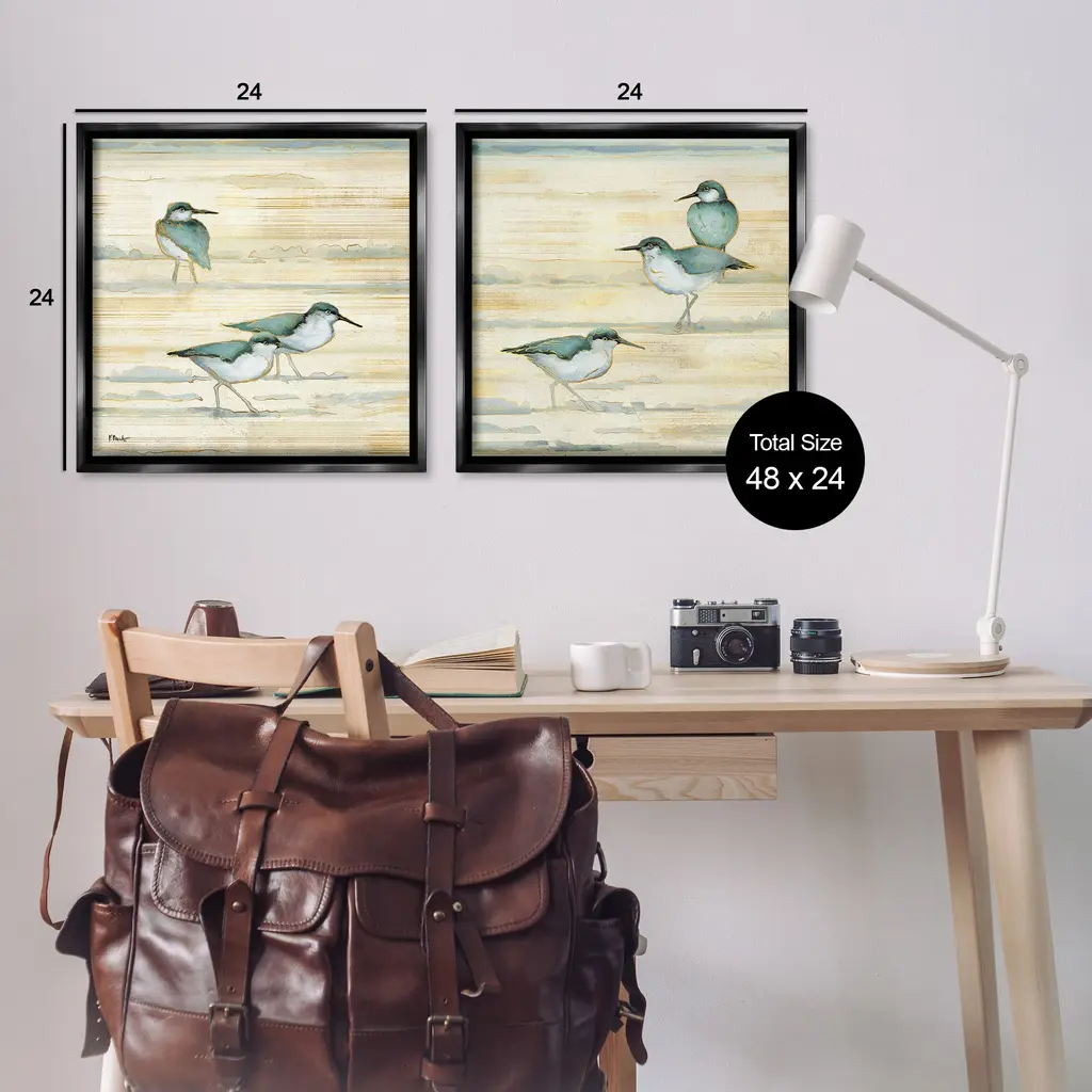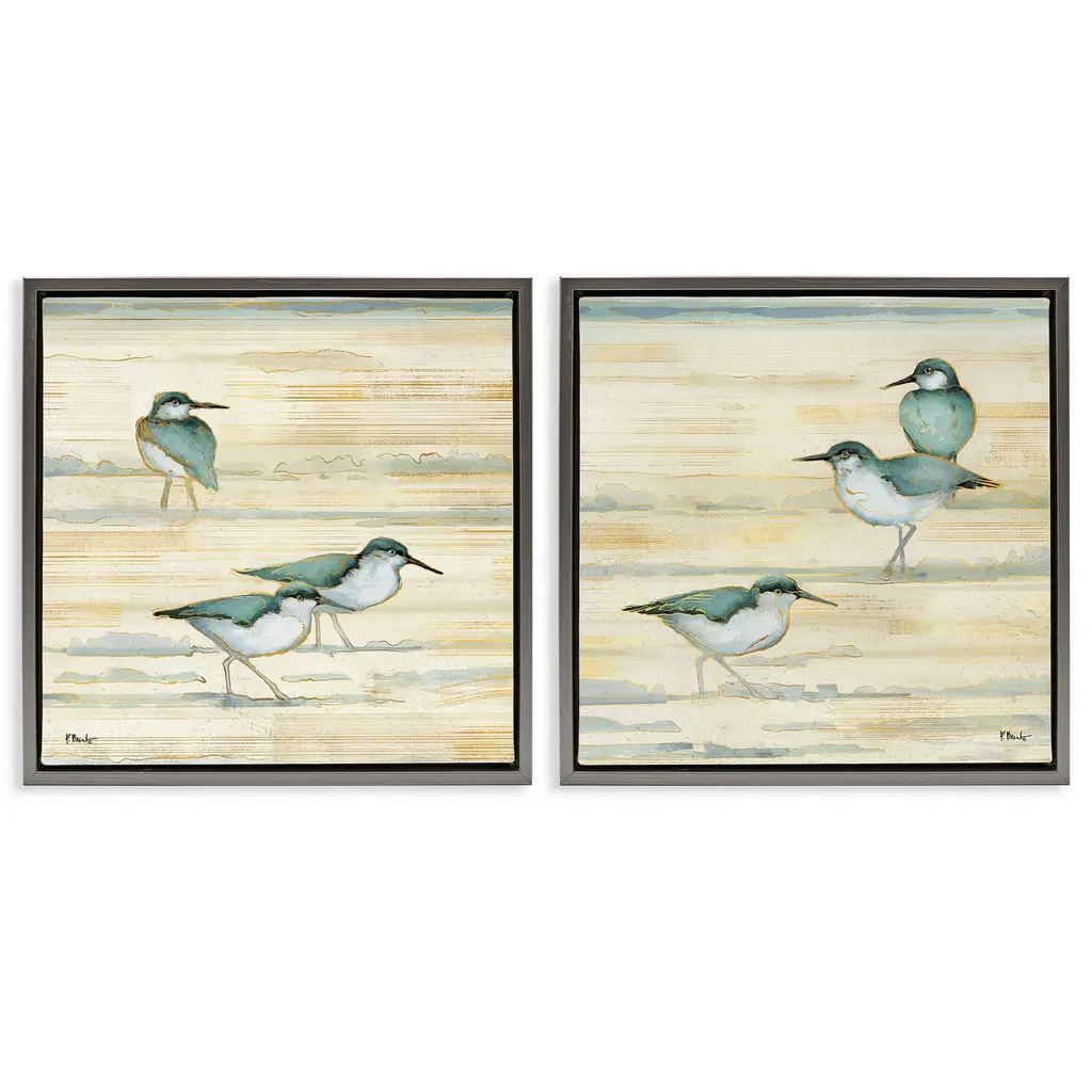 Elevate your home or office to the next level with Stupell Framed Floating Canvas Wall Art. Our premium hand-stretched canvas is mounted securely into a sturdy lightweight frame. The museum-style gap between the wrapped canvas and the box frame gives the illusion of floating artwork. Stupell Wall Art is made in the USA.Features: Dimensions: 2 Piece Set, Each Frame is 18 x 1.7 x 18Two Piece Floating Frame Canvas Products are available as 18"x18" or 25"x25" Panels. All Floating Frame Canvas Products have a 1.7" Depth.Wall Art is Ready to Hang with Hardware Free Hanging. No Installation required. For Easy Set Up Lean or Layer Artwork on Shelf or Against Wall. Artwork is Permently Fixed into the Frame.Our elevated 1.7" Thick Floating Frame is the perfect complement to our canvas style Wall Art. We use only the highest quality inks in house with industry leading printing solutions. Canvas is hand stretched over a durable wood foundation and then mounted securly into a Modern Box Frame. Made in the USA.Artwork Relates To: Bird, Animal, Sea, Nature, Water, Ocean, Sandpipers, Beach, Shore, PaintingDesign by Paul Brent