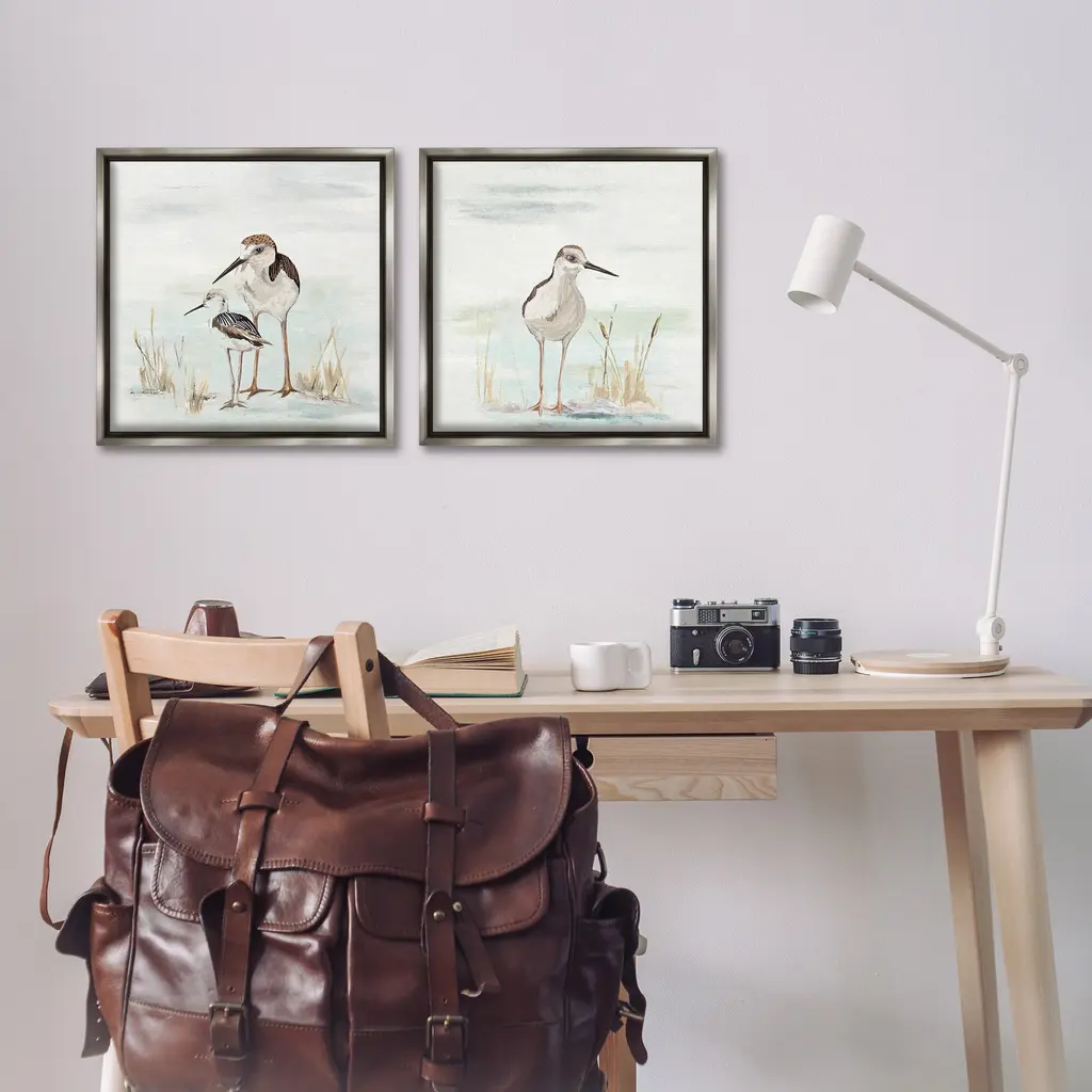 Elevate your home or office to the next level with Stupell Framed Floating Canvas Wall Art. Our premium hand-stretched canvas is mounted securely into a sturdy lightweight frame. The museum-style gap between the wrapped canvas and the box frame gives the illusion of floating artwork. Stupell Wall Art is made in the USA.Features: Dimensions: 2 Piece Set, Each Frame is 18 x 1.7 x 18Two Piece Floating Frame Canvas Products are available as 18"x18" or 25"x25" Panels. All Floating Frame Canvas Products have a 1.7" Depth.Wall Art is Ready to Hang with Hardware Free Hanging. No Installation required. For Easy Set Up Lean or Layer Artwork on Shelf or Against Wall. Artwork is Permently Fixed into the Frame.Our elevated 1.7" Thick Floating Frame is the perfect complement to our canvas style Wall Art. We use only the highest quality inks in house with industry leading printing solutions. Canvas is hand stretched over a durable wood foundation and then mounted securly into a Modern Box Frame. Made in the USA.Artwork Relates To: Bird, Animal, Sandpiper, Beach, Nautical, Coastal, ShoreDesign by Patricia Pinto