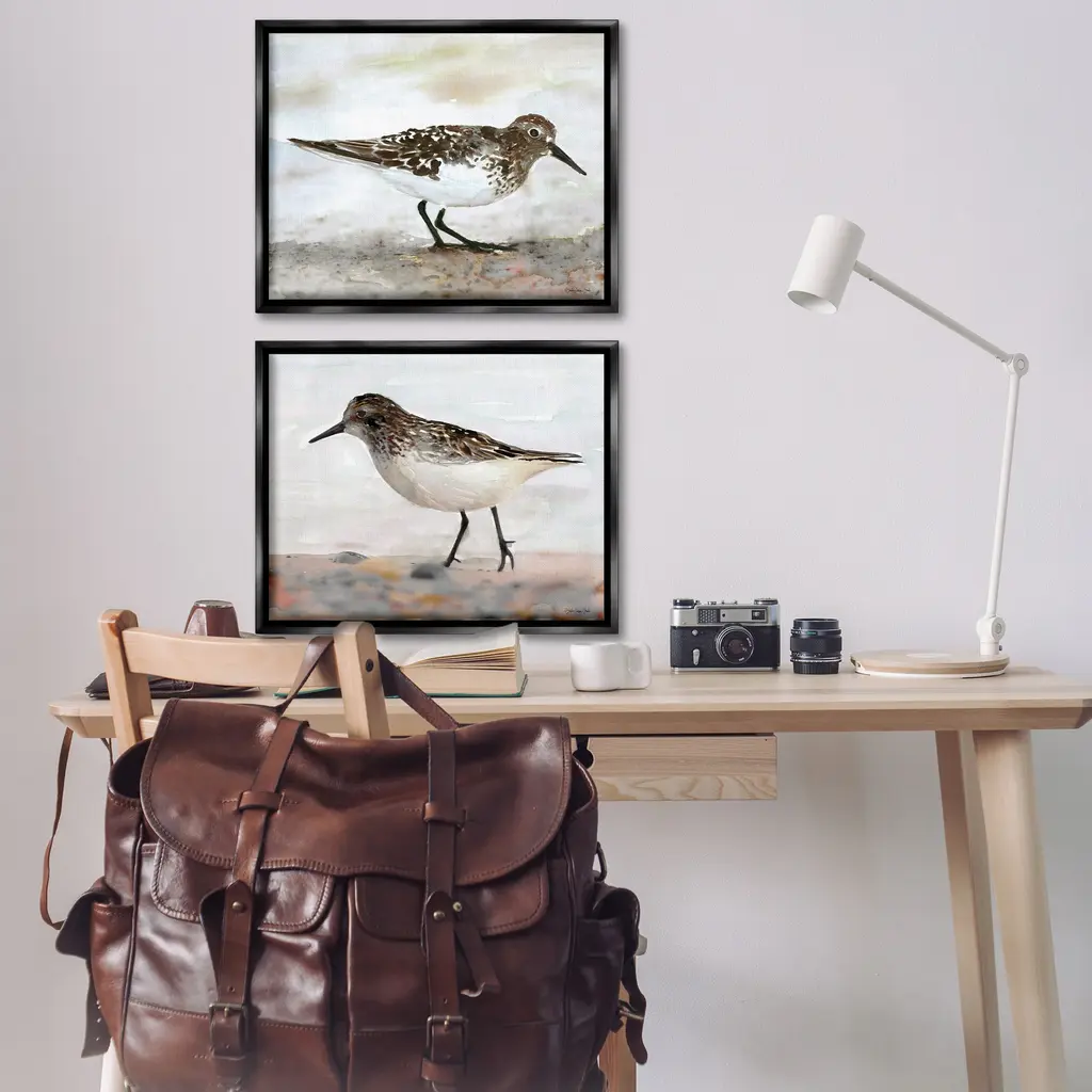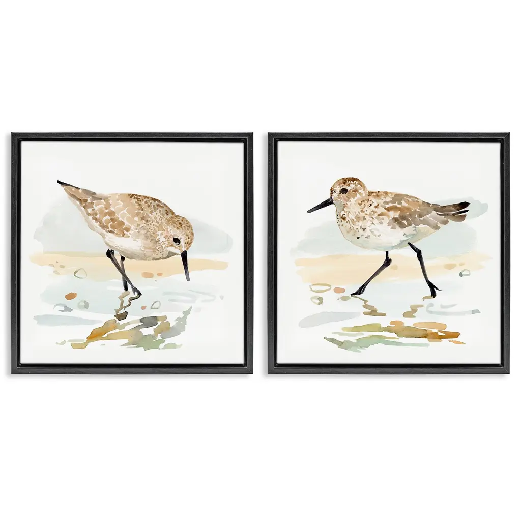 Elevate your home or office to the next level with Stupell Framed Floating Canvas Wall Art. Our premium hand-stretched canvas is mounted securely into a sturdy lightweight frame. The museum-style gap between the wrapped canvas and the box frame gives the illusion of floating artwork. Stupell Wall Art is made in the USA.Features: Dimensions: 2 Piece Set, Each Frame is 17 x 1.7 x 21Two Piece Floater Framed Canvas are available as 21"x17" or 31"x24" Panels. All Floater Frame Products have a 1.7" Depth.Wall Art is Ready to Hang with Hardware Free Hanging. No Installation required. For Easy Set Up Lean or Layer Artwork on Shelf or Against Wall. Artwork is Permently Fixed into the Frame.Our elevated 1.7" Thick Floating Frame is the perfect complement to our canvas style Wall Art. We use only the highest quality inks in house with industry leading printing solutions. Canvas is hand stretched over a durable wood foundation and then mounted securly into a Modern Box Frame. Made in the USA.Artwork Relates To: Beach, Nautical, Animal, Bird, Sandpiper, Shore, TraditionalDesign by Stellar Design Studio