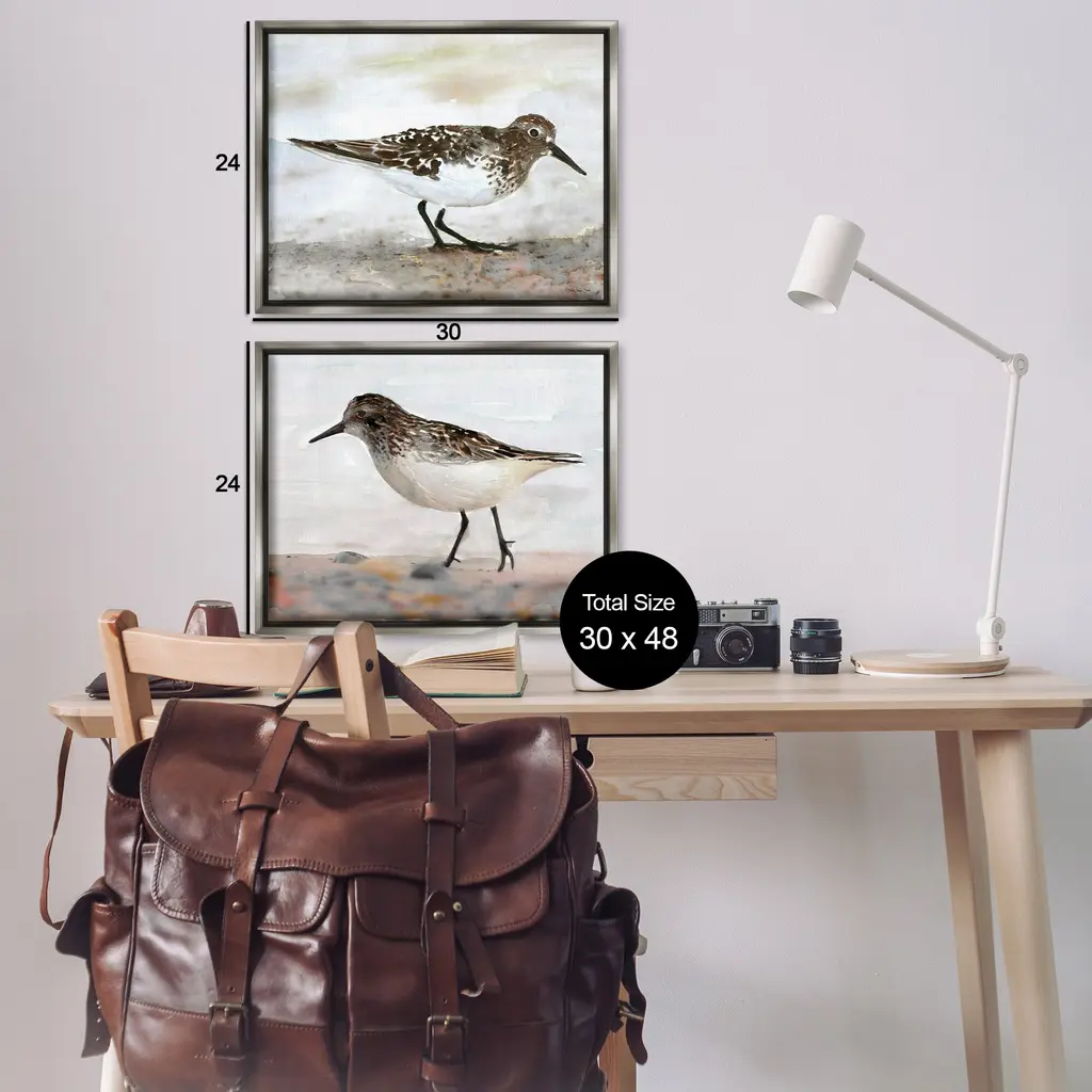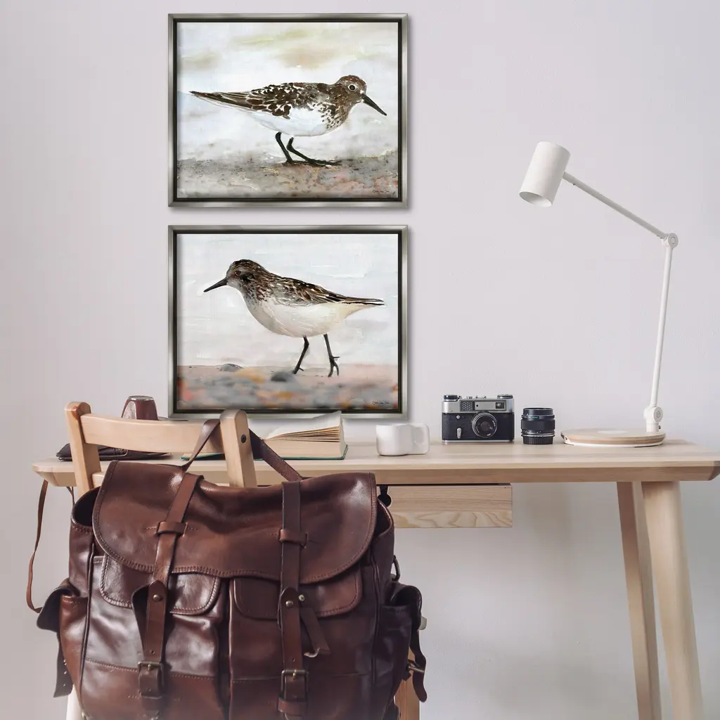 Elevate your home or office to the next level with Stupell Framed Floating Canvas Wall Art. Our premium hand-stretched canvas is mounted securely into a sturdy lightweight frame. The museum-style gap between the wrapped canvas and the box frame gives the illusion of floating artwork. Stupell Wall Art is made in the USA.Features: Dimensions: 2 Piece Set, Each Frame is 17 x 1.7 x 21Two Piece Floater Framed Canvas are available as 21"x17" or 31"x24" Panels. All Floater Frame Products have a 1.7" Depth.Wall Art is Ready to Hang with Hardware Free Hanging. No Installation required. For Easy Set Up Lean or Layer Artwork on Shelf or Against Wall. Artwork is Permently Fixed into the Frame.Our elevated 1.7" Thick Floating Frame is the perfect complement to our canvas style Wall Art. We use only the highest quality inks in house with industry leading printing solutions. Canvas is hand stretched over a durable wood foundation and then mounted securly into a Modern Box Frame. Made in the USA.Artwork Relates To: Beach, Nautical, Animal, Bird, Sandpiper, Shore, TraditionalDesign by Stellar Design Studio