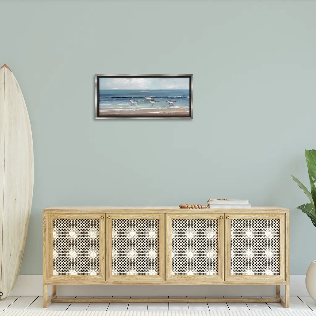 Elevate your home or office to the next level with Stupell Framed Floating Canvas Wall Art. Our premium hand-stretched canvas is mounted securely into a sturdy lightweight frame. The museum-style gap between the wrapped canvas and the box frame gives the illusion of floating artwork. Stupell Wall Art is made in the USA.Features: Dimensions: 25 x 1.7 x 11 Frame, 24 x 1.5 x 10 Canvas ArtFloating Frame Canvas Products are available in sizes 25"x11" and 31"x14". All Floating Frame Canvas Products have a 1.7" Depth.Wall Art is Ready to Hang with Hardware Free Hanging. No Installation required. For Easy Set Up Lean or Layer Artwork on Shelf or Against Wall. Artwork is Permently Fixed into the Frame.Our elevated 1.7" Thick Floating Frame is the perfect complement to our canvas style Wall Art. We use only the highest quality inks in house with industry leading printing solutions. Canvas is hand stretched over a durable wood foundation and then mounted securly into a Modern Box Frame. Made in the USA.Artwork Relates To: Bird, Animal, Painting, Shoreline, Water, Sea, Ocean, Nature, Coast, Sandpiper Design by Sally Swatland