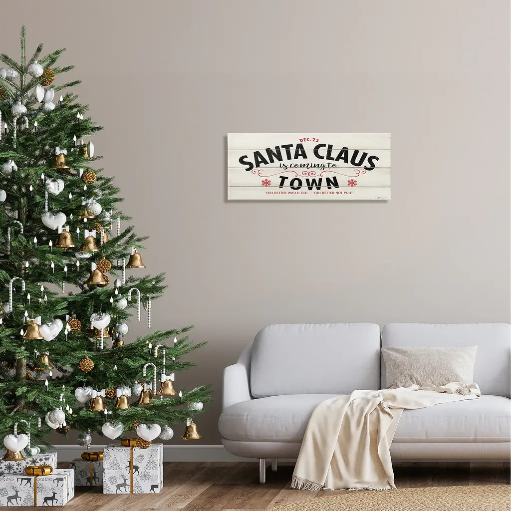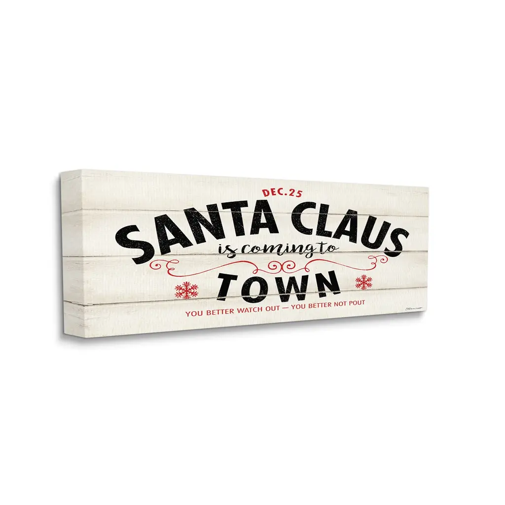 We create our stretched canvas to the highest standards. Using only the highest quality inks and canvas on Mimaki printers, we hand-cut and stretch each piece over a 1.5-inch thick wooden frame for hanging. As a result, the art comes ready to hang on the sturdy ledge with no installation required. Stupell Wall Art is made in the USA.Features: Dimensions: 24 x 1.5 x 10 InchesStretched Canvas Sizes Include Standard: 24 x 1.5 x 10 Large: 30 x 1.5 x 13 X-Large: 40 x 1.5 x 17 Oversized: 48 x 1.5 x 20Wall Art is Ready to Hang - No Installation or Hardware Needed. For Easy Set Up Lean or Layer Artwork on Shelf or Against Wall.Our stretched canvas is created with the highest standards. We use only the highest quality inks and canvas on our in house Mimaki printers, and then hand cut and stretch each piece over a 1.5 inch thick wooden frame for hanging. Made In USA.Artwork Relates To: Holiday, Christmas, Rustic, Vintage, Santa Claus Is Coming To Town, You Better Watch Out You Better Not PoutDesign by Stephanie Workman Marrott