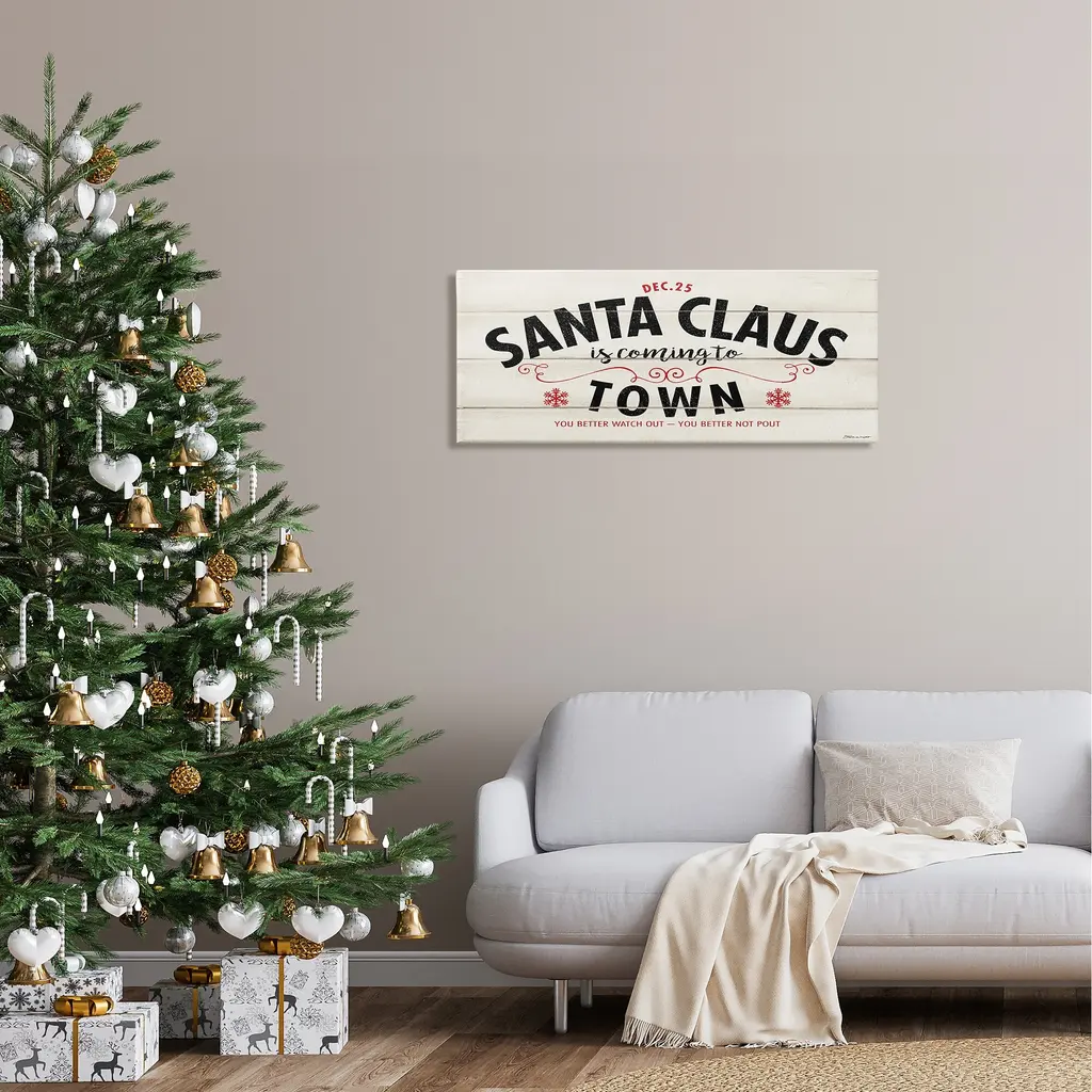 We create our stretched canvas to the highest standards. Using only the highest quality inks and canvas on Mimaki printers, we hand-cut and stretch each piece over a 1.5-inch thick wooden frame for hanging. As a result, the art comes ready to hang on the sturdy ledge with no installation required. Stupell Wall Art is made in the USA.Features: Dimensions: 24 x 1.5 x 10 InchesStretched Canvas Sizes Include Standard: 24 x 1.5 x 10 Large: 30 x 1.5 x 13 X-Large: 40 x 1.5 x 17 Oversized: 48 x 1.5 x 20Wall Art is Ready to Hang - No Installation or Hardware Needed. For Easy Set Up Lean or Layer Artwork on Shelf or Against Wall.Our stretched canvas is created with the highest standards. We use only the highest quality inks and canvas on our in house Mimaki printers, and then hand cut and stretch each piece over a 1.5 inch thick wooden frame for hanging. Made In USA.Artwork Relates To: Holiday, Christmas, Rustic, Vintage, Santa Claus Is Coming To Town, You Better Watch Out You Better Not PoutDesign by Stephanie Workman Marrott